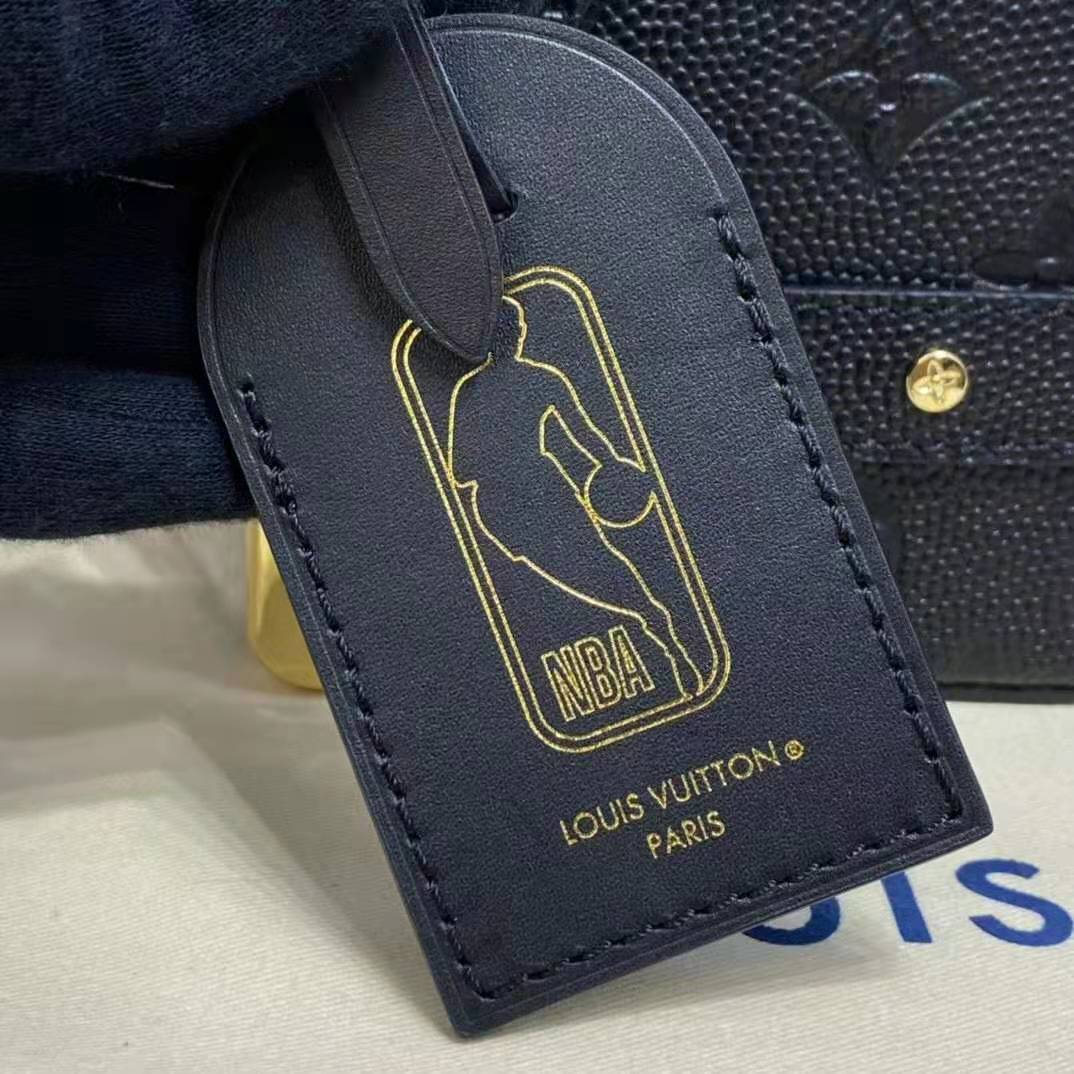 The rivets, the metallic corners, and the leather strap all evoke the trunks of the House’s beginnings while a discreet NBA logo adorns the removable strap.