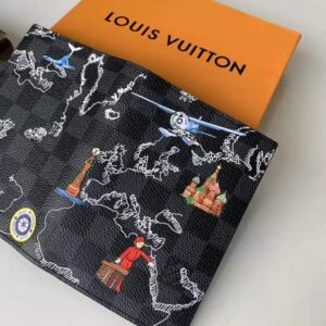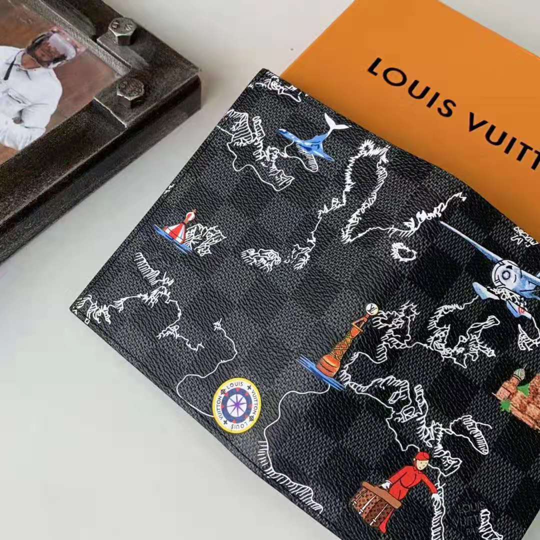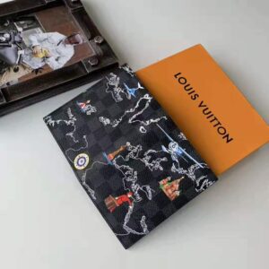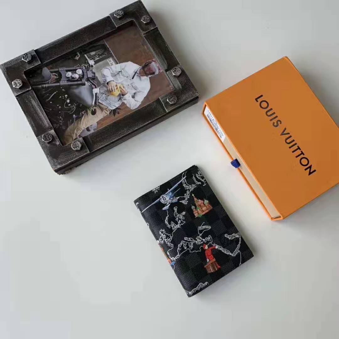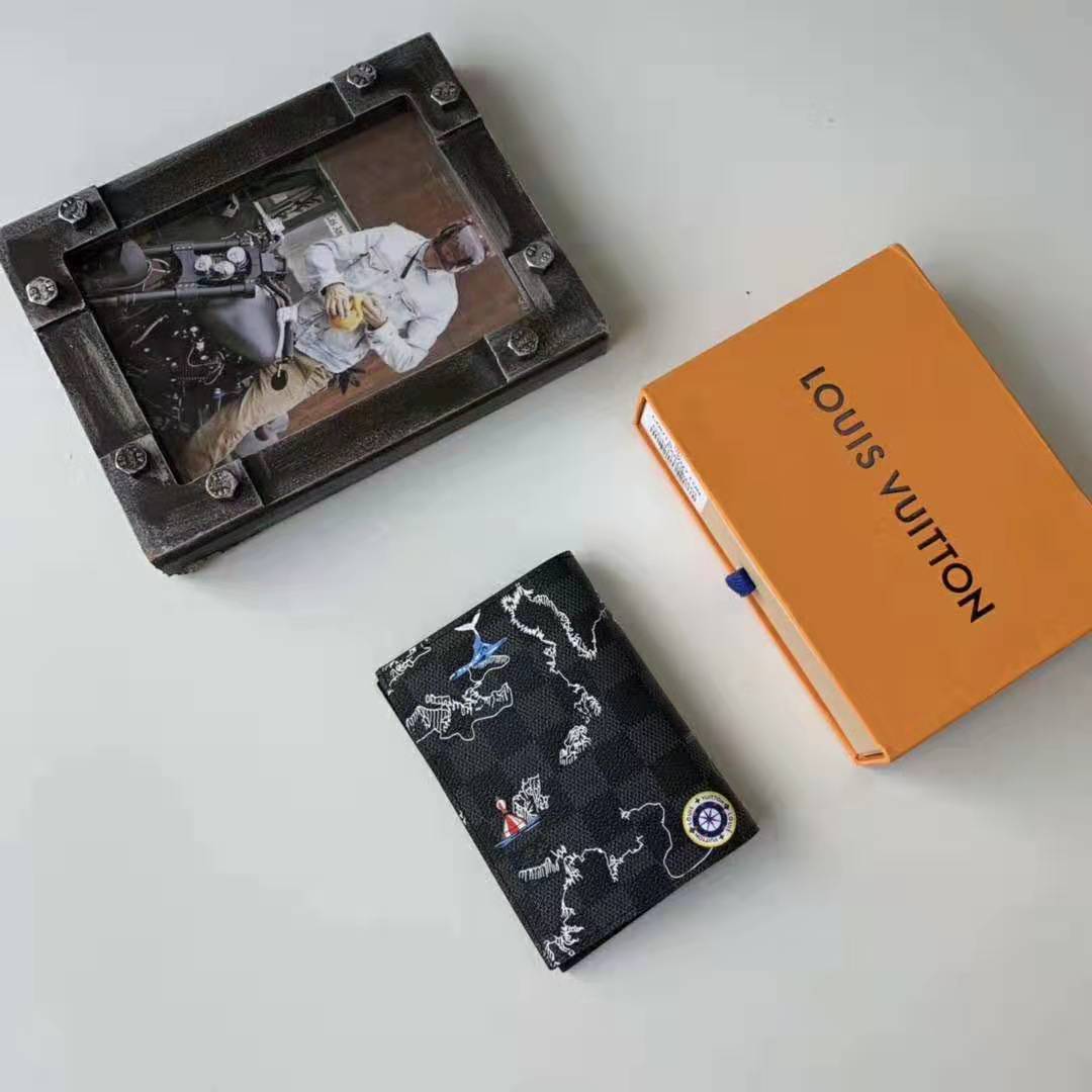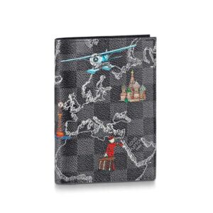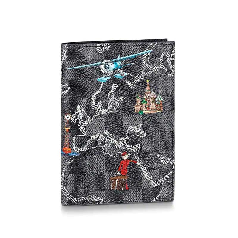 Travel the world in style with this Passport Cover in Damier Graphite canvas adorned with a map motif featuring vintage-style illustrations inspired by Louis Vuitton’s archives.