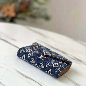 It is crafted from blue jacquard, woven with motifs of Monogram Flowers and the inscription Since 1854, when Louis Vuitton was founded.