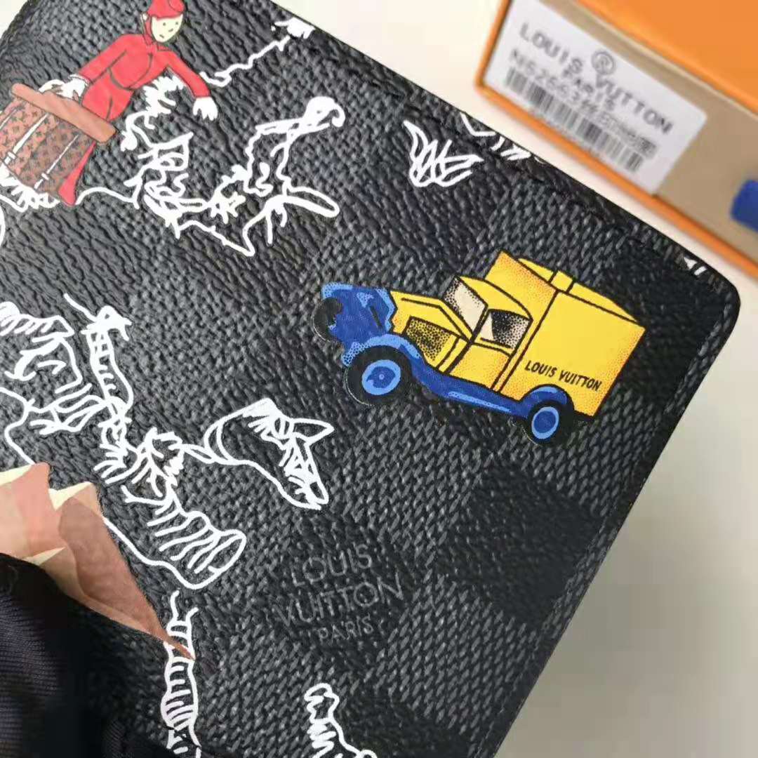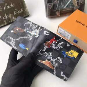 Made from Damier Graphite canvas, this Slender Wallet is decorated with a map of Europe and colorful illustrations evocative of Renaissance cartography.