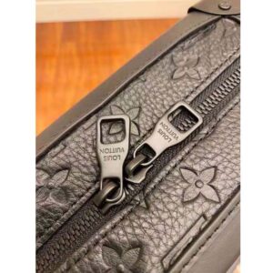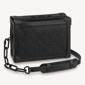 The black-on-black Soft Trunk bag in Monogram-embossed black Taurillon leather with matte-black zipper and strap is a new take on the traditional messenger bag.