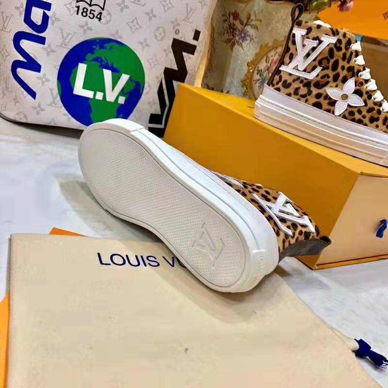 Crafted from pony-styled calfskin with a bold leopard print, this version of the Stellar sneaker boot belongs to the LV Jungle capsule of leather goods and accessories.