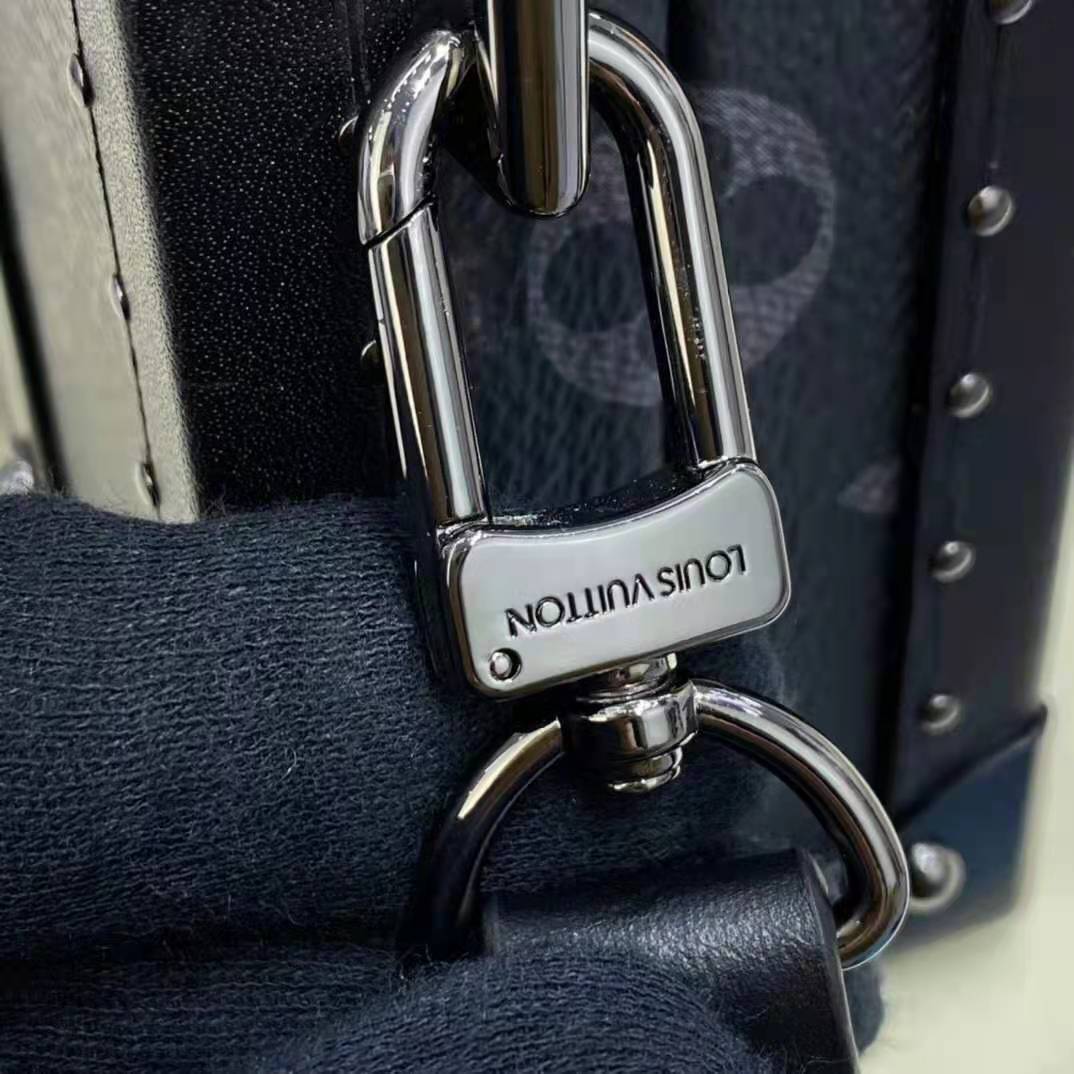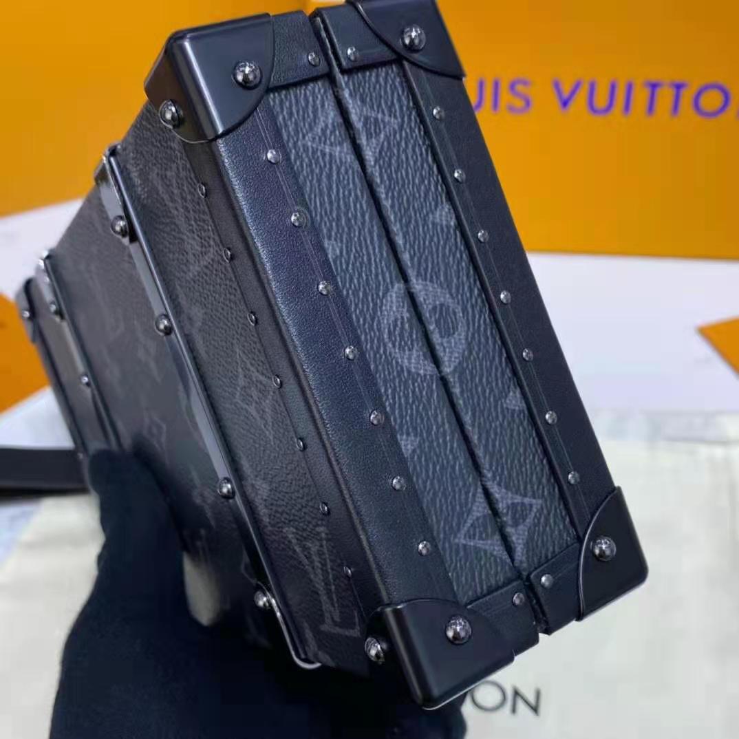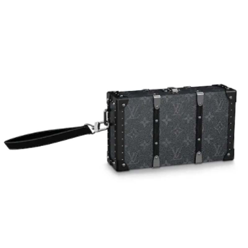 Monogram Eclipse canvas brings a masculine feel to Virgil Abloh’s Wallet Trunk, a hard-sided clutch wallet that evokes the trunks manufactured by the House in its early days.