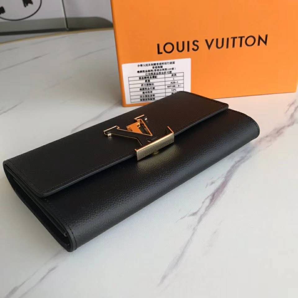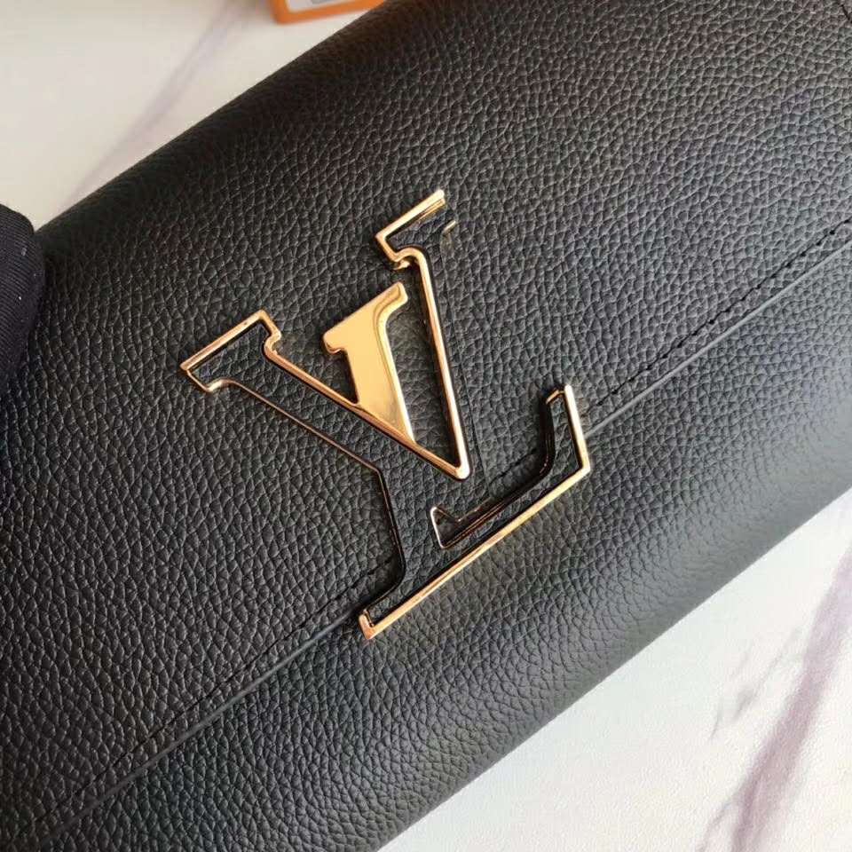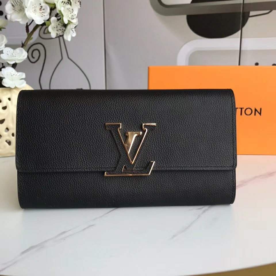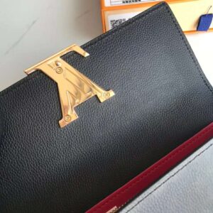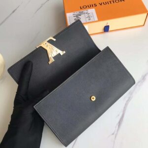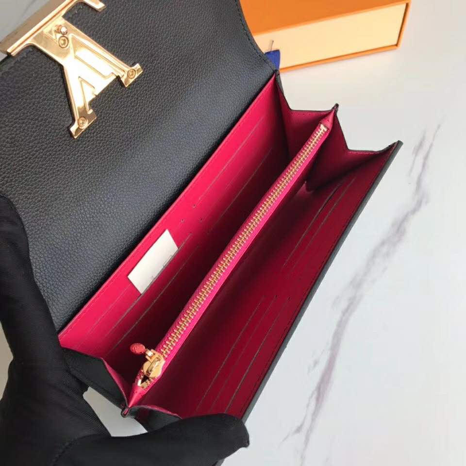 Crafted in supple Taurillon leather with a leather-covered LV signature, this elegant wallet is inspired by the emblematic Capucines line.