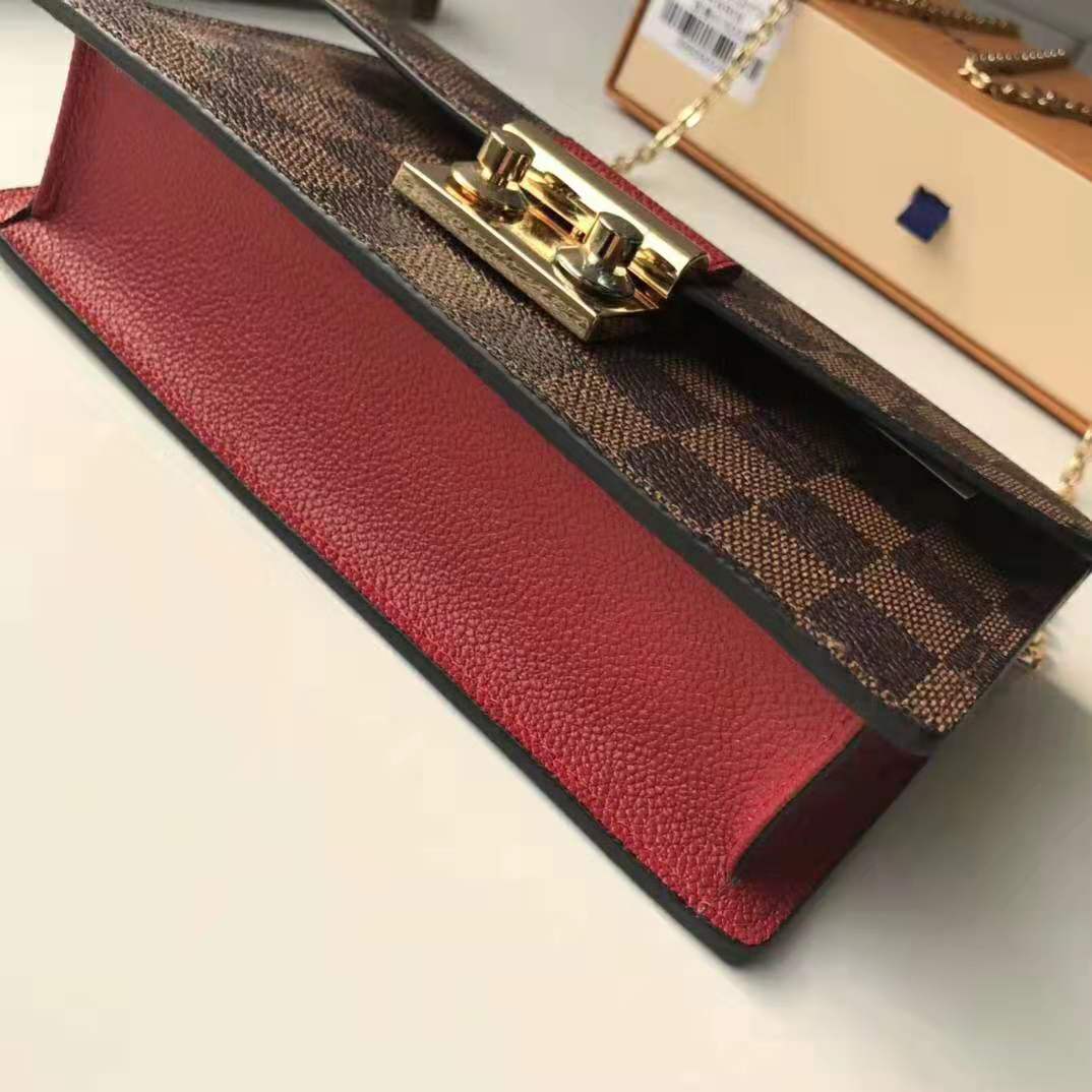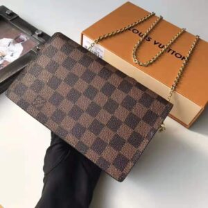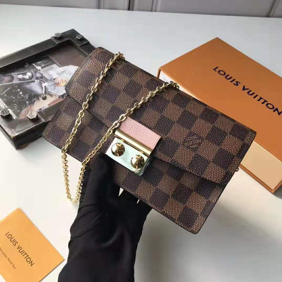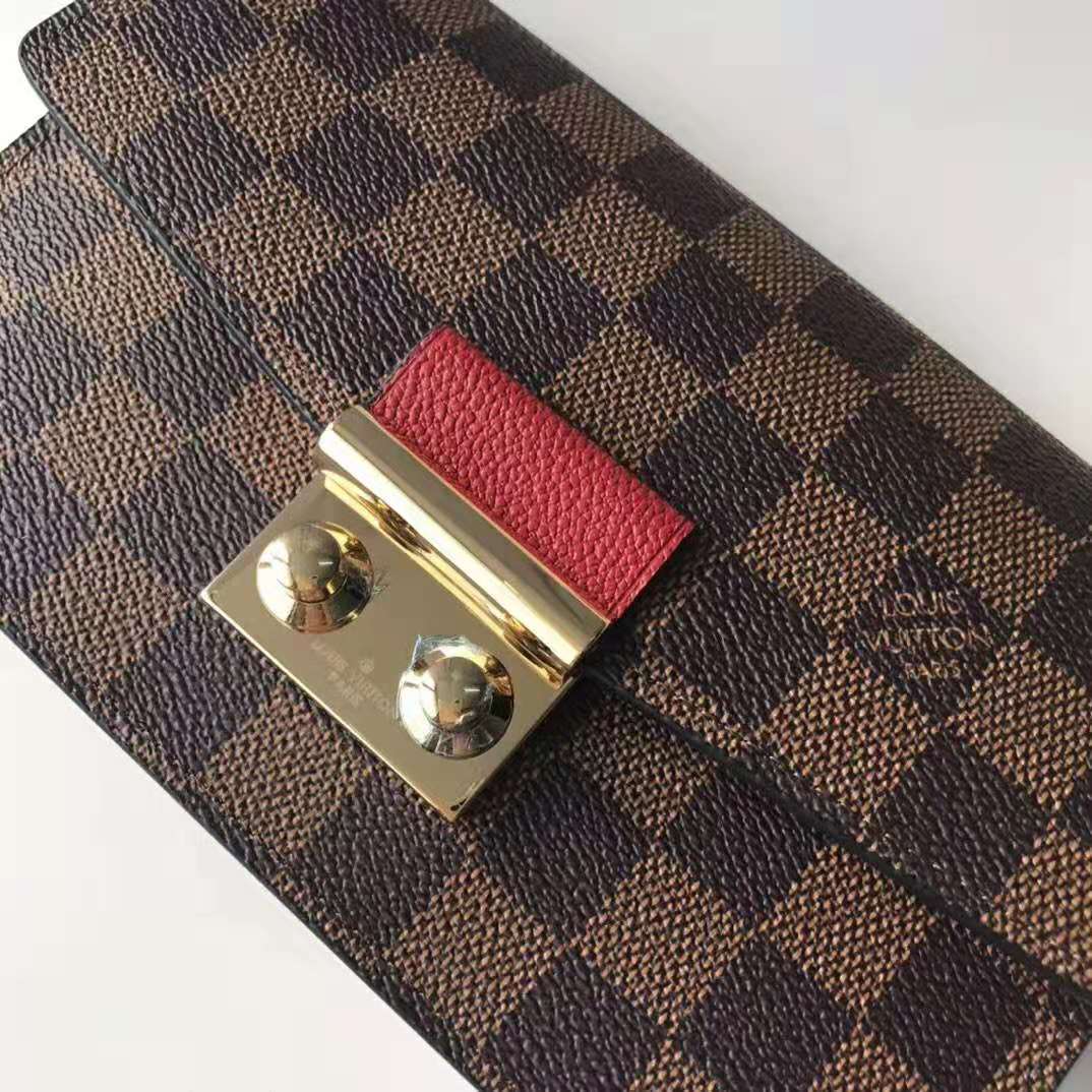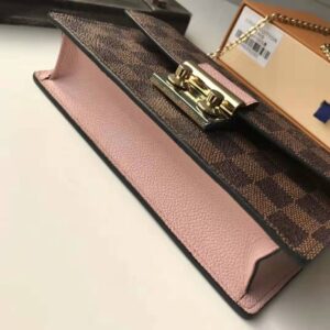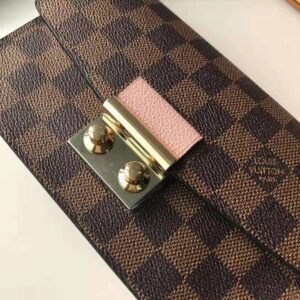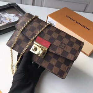 Inspired by the Croisette handbag, the Croisette chain wallet revisits the key codes of its design: the combination of Damier Ebene canvas and colored leather, and the S-lock, historically used on Louis Vuitton trunks.