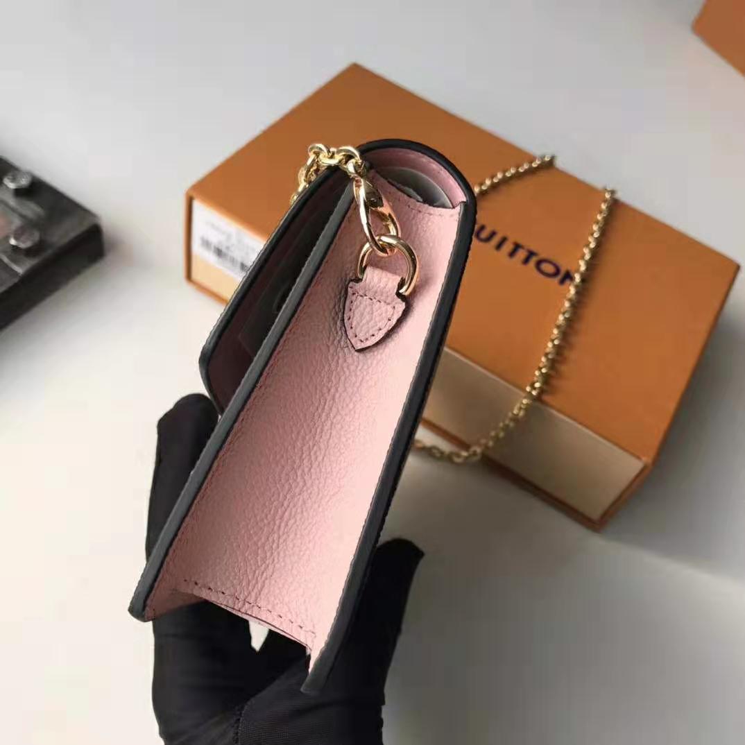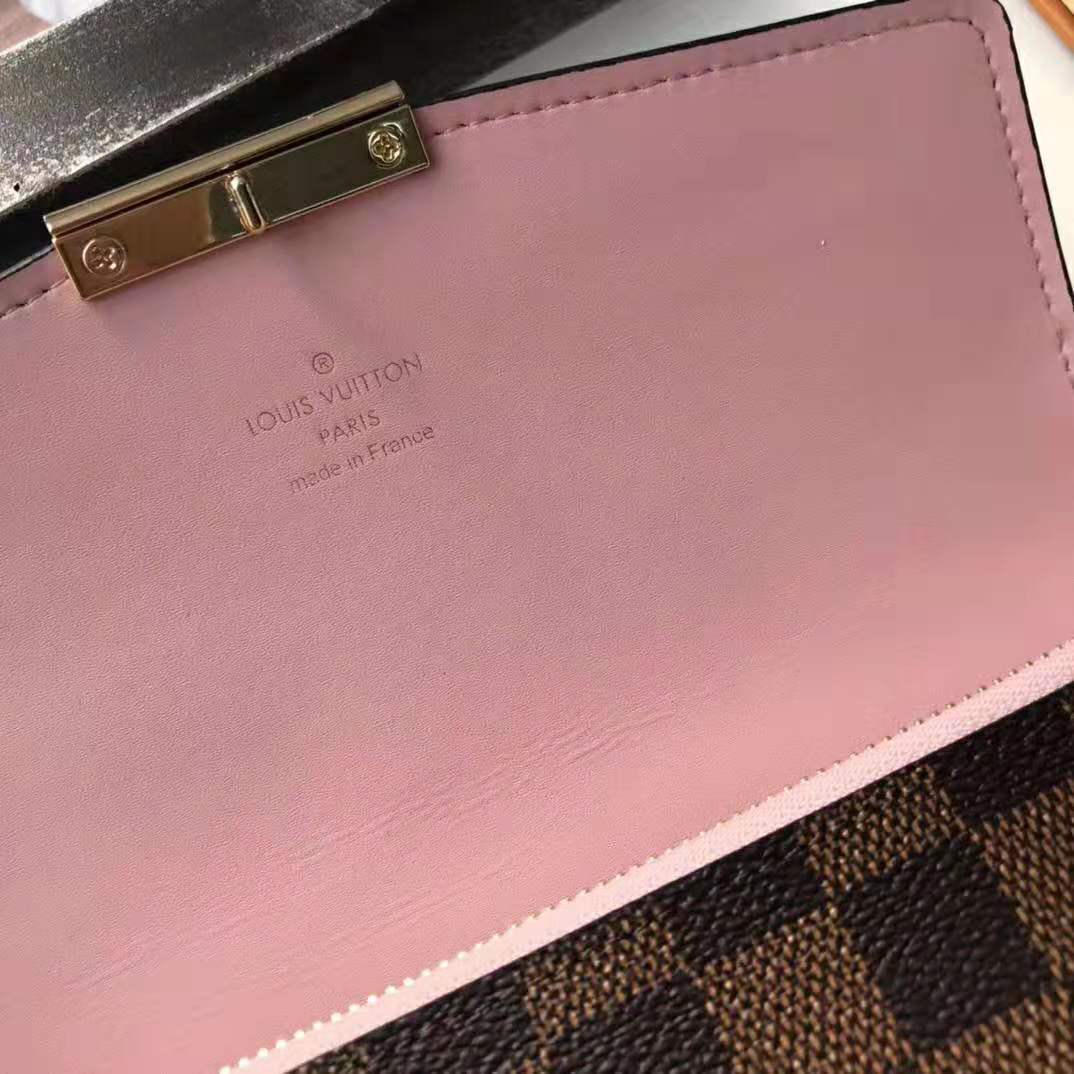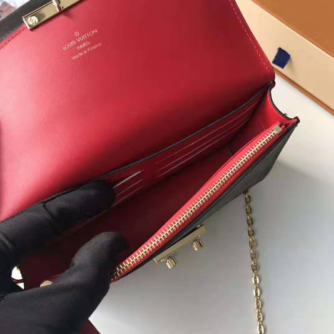 Inspired by the Croisette handbag, the Croisette chain wallet revisits the key codes of its design: the combination of Damier Ebene canvas and colored leather, and the S-lock, historically used on Louis Vuitton trunks.