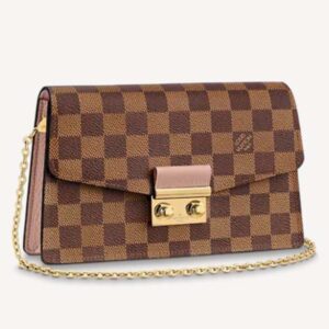 Inspired by the Croisette handbag, the Croisette chain wallet revisits the key codes of its design: the combination of Damier Ebene canvas and colored leather, and the S-lock, historically used on Louis Vuitton trunks.