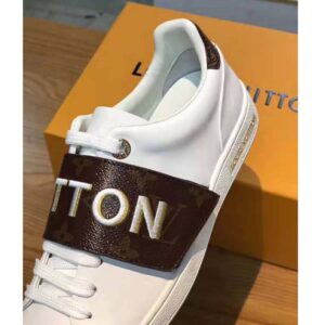 Reinterpreting the classic tennis shoe, this stylish sneaker in Louis Vuitton’s iconic patent Monogram canvas has a clean-cut design complemented by black patent leather trim and subtle gold metal details.