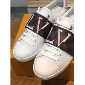 Louis Vuitton’s classic Frontrow sneaker in white calf leather is revisited this season with a wide strap in historic Damier canvas.