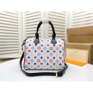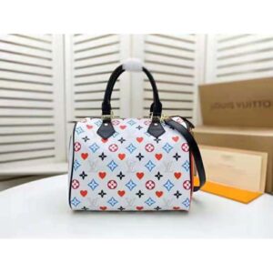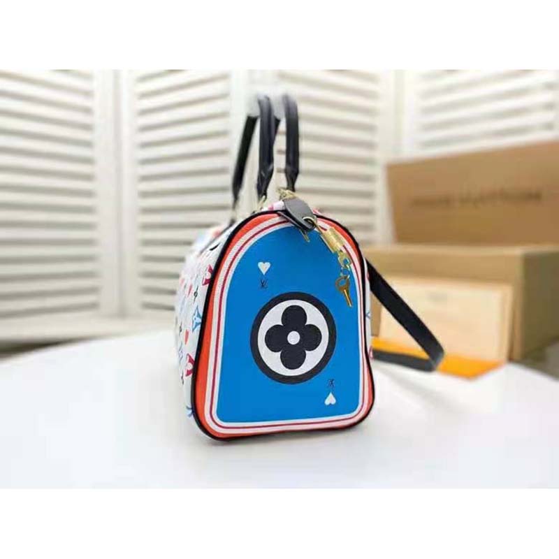Taking inspiration from playing cards, Nicolas Ghesquière creates a bold bright version of the Monogram motif for this Speedy Bandoulière 25 in canvas.
