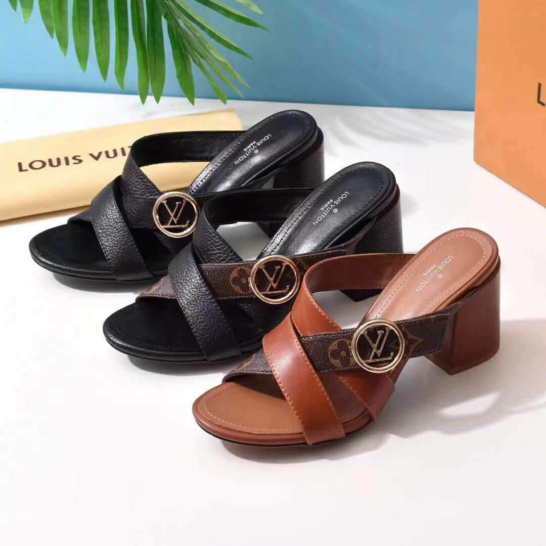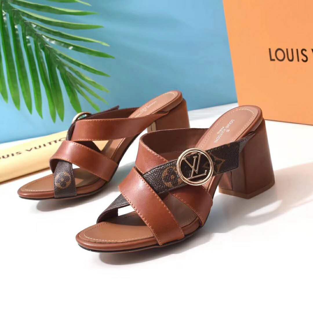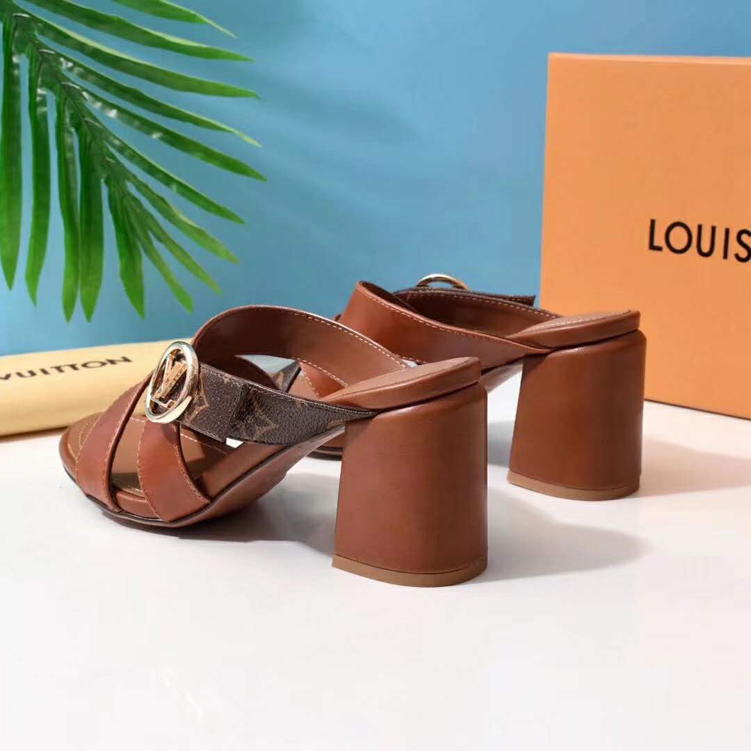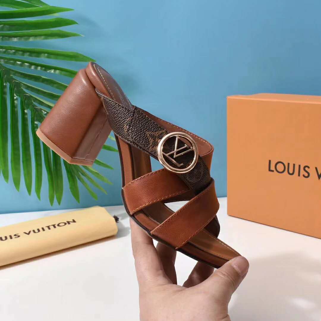 Louis Vuitton’s iconic Monogram canvas is combined with supple tan calf leather on the Horizon block-heeled mule.