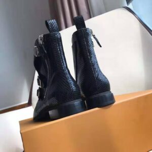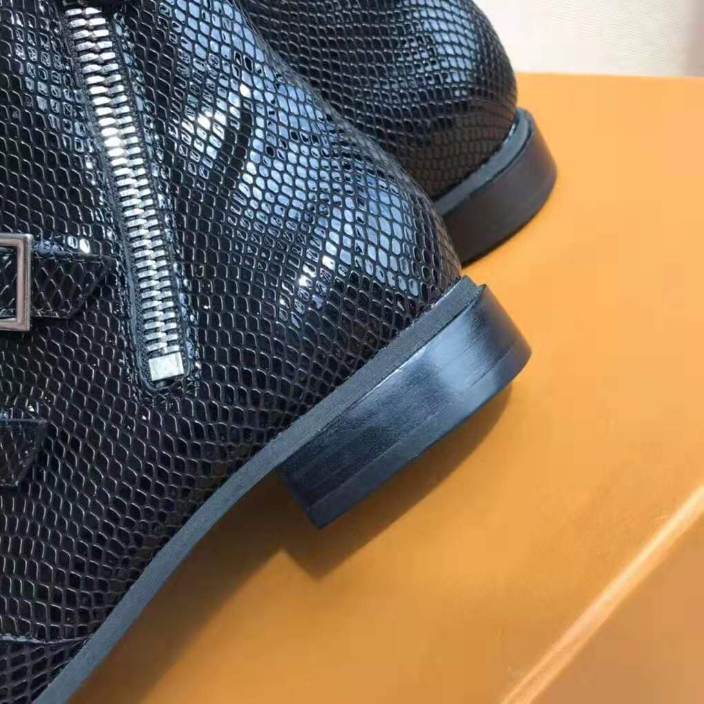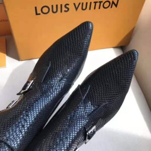 Crafted from black python skin, the Jumble flat ankle boot is an edgy, boyish style seen at Louis Vuitton’s Spring-Summer 2019 fashion show.
