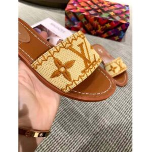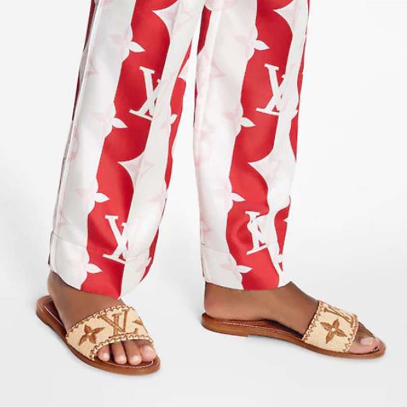 Its wide front strap is crafted from raffia, which is embroidered with the LV Intials and Monogram Flowers.