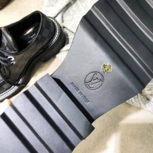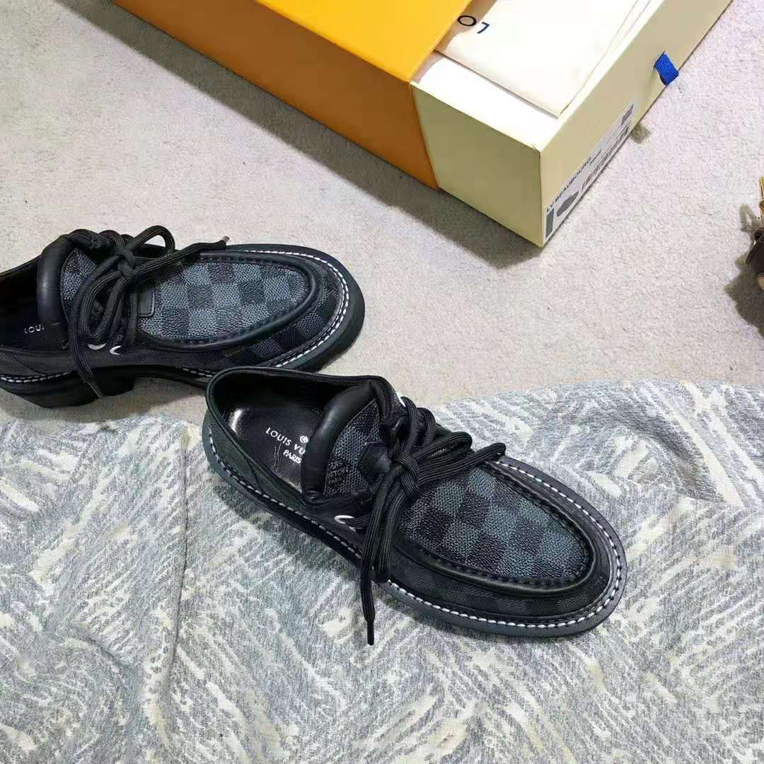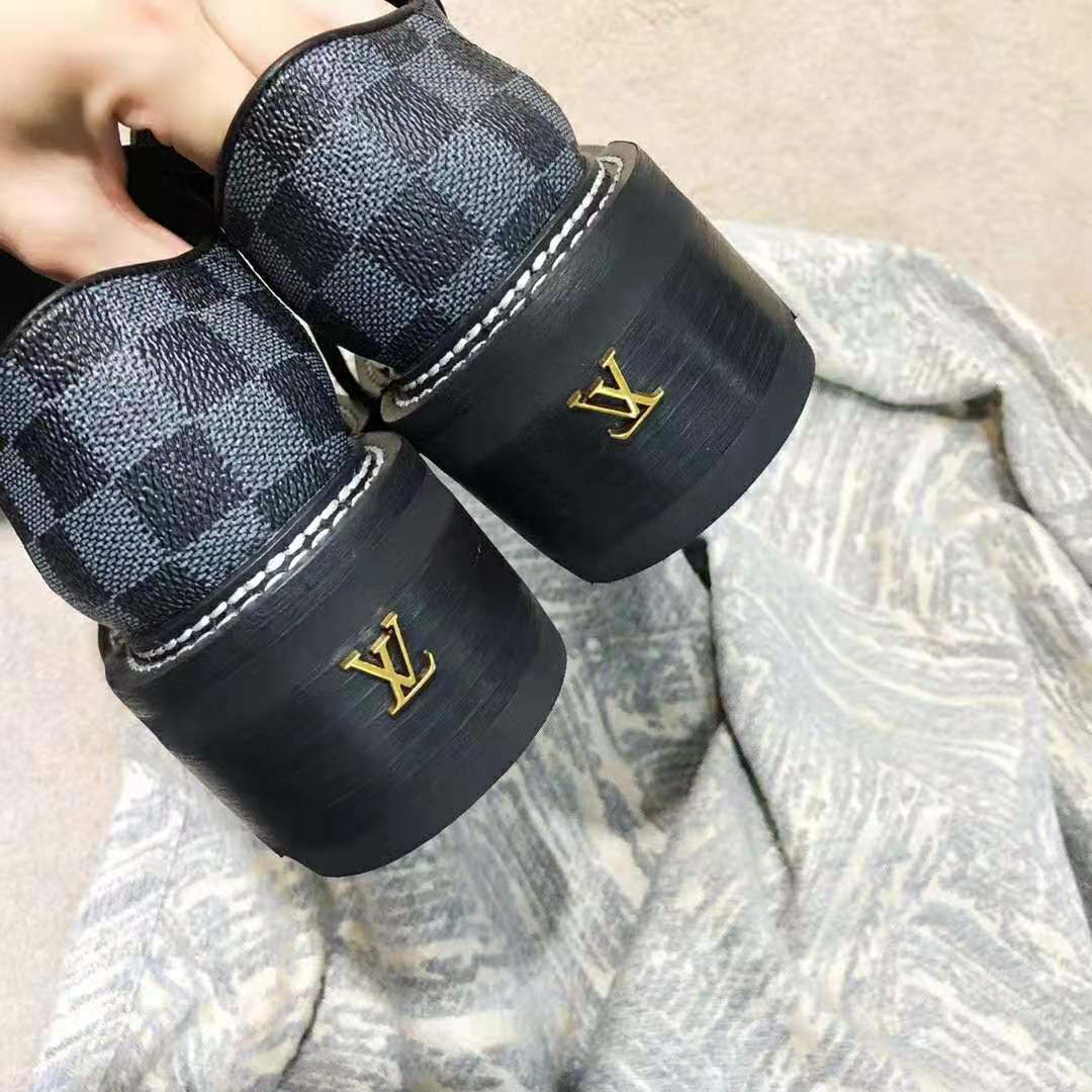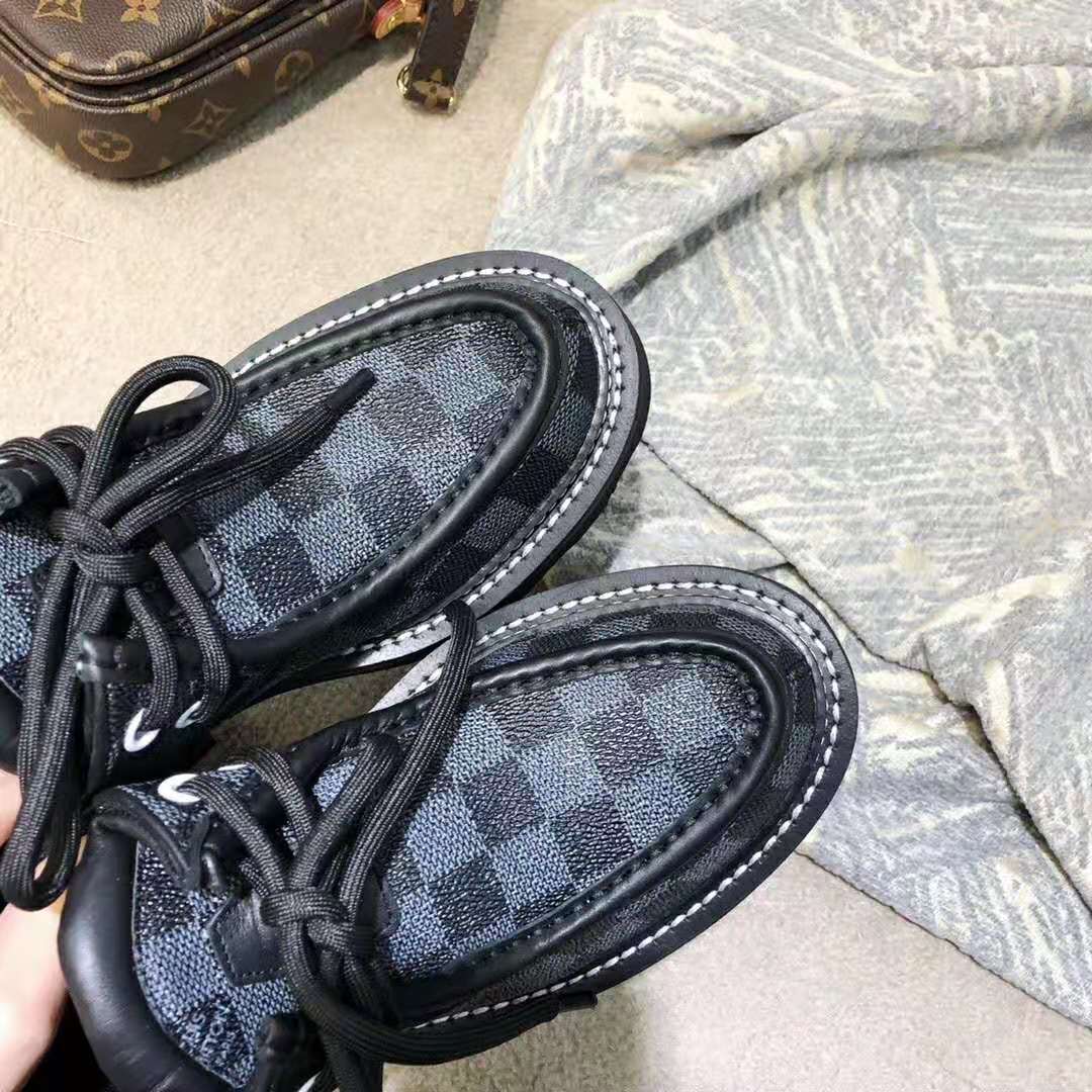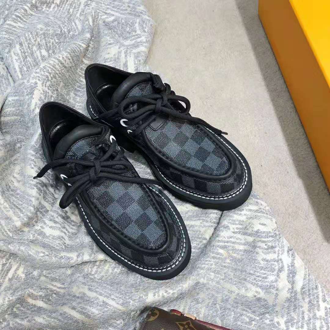 The standout shoe of Louis Vuitton’s Fall-Winter 2019 fashion show, the LV Beaubourg platform derby is crafted from Damier Graphite canvas.