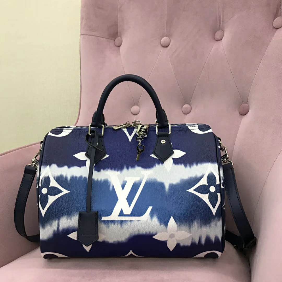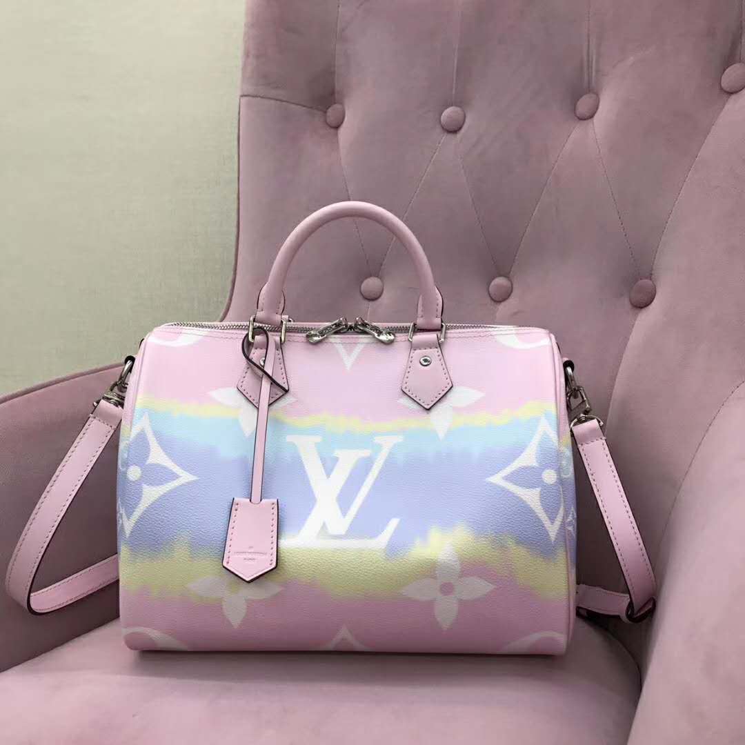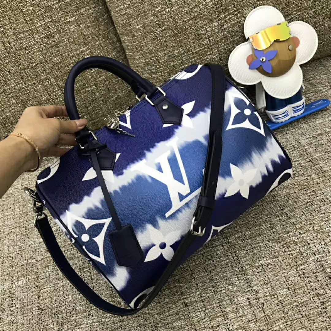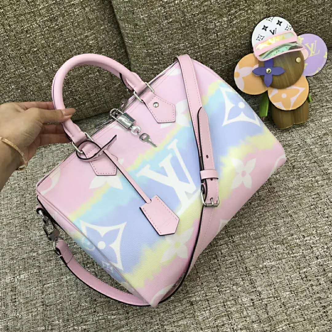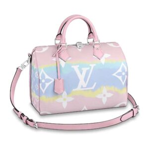 Tie-Dye Monogram canvas brings a beachy feel to the Speedy Bandoulière 30, a classic Louis Vuitton city bag relooked for the LV Escale Collection.