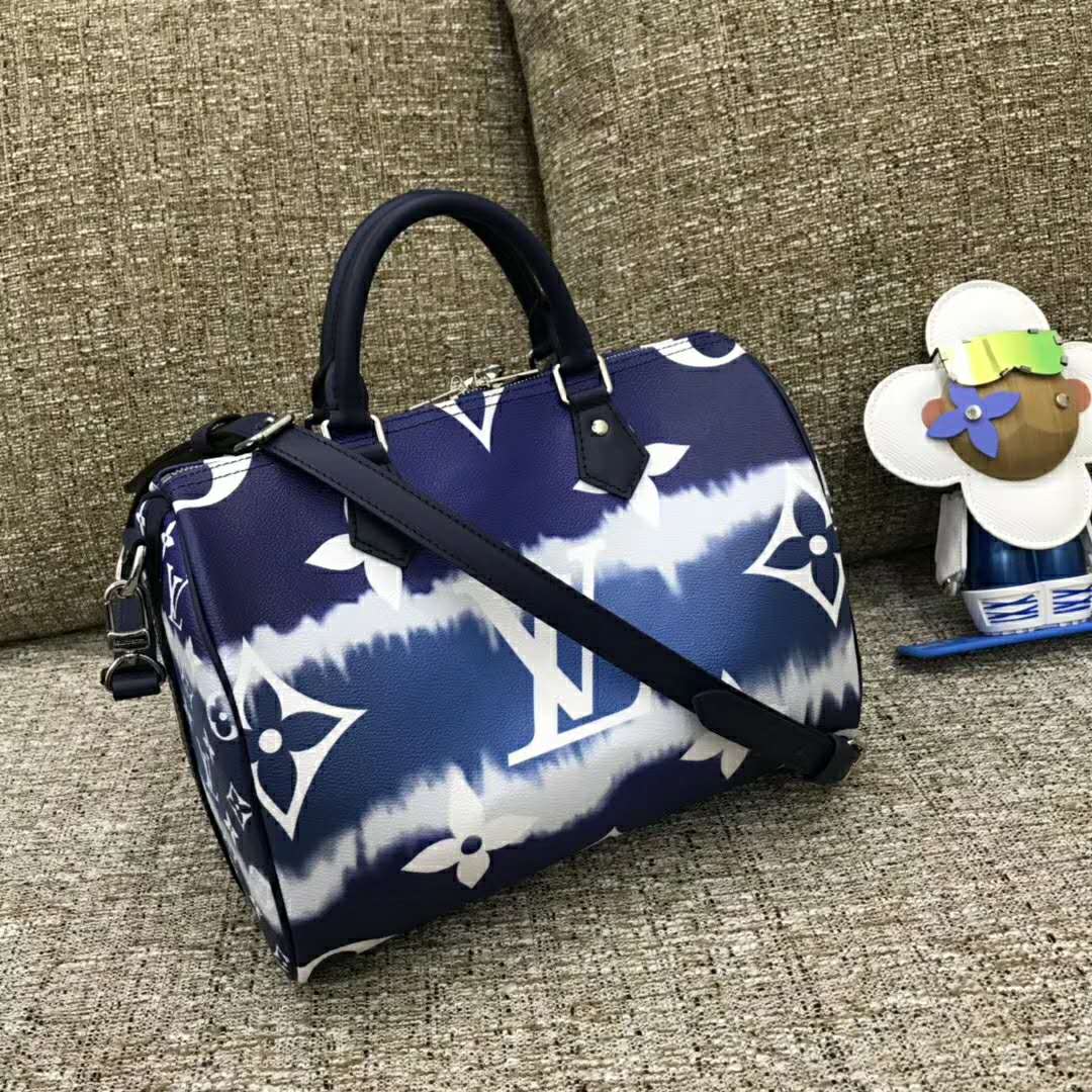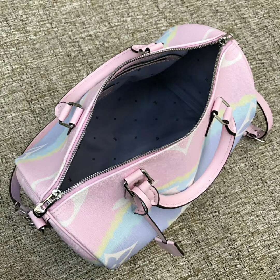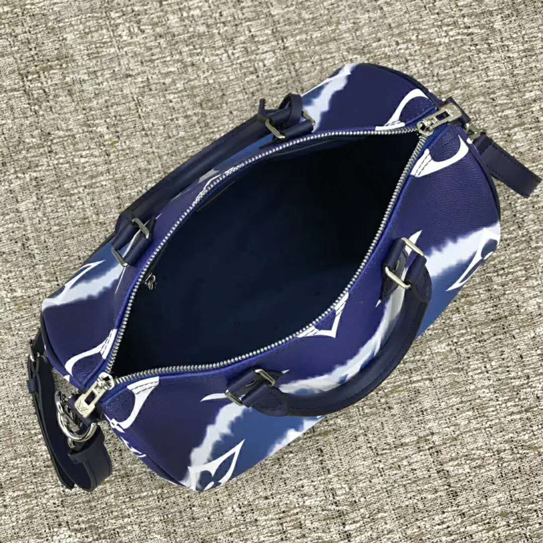 Tie-Dye Monogram canvas brings a beachy feel to the Speedy Bandoulière 30, a classic Louis Vuitton city bag relooked for the LV Escale Collection.