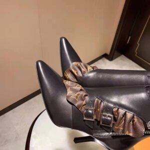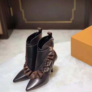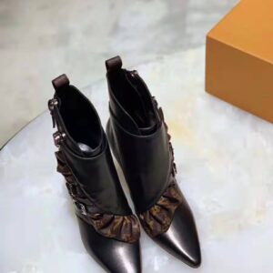 The Janet ankle boot combines black calf leather with a ruffle in Louis Vuitton’s iconic Monogram canvas.