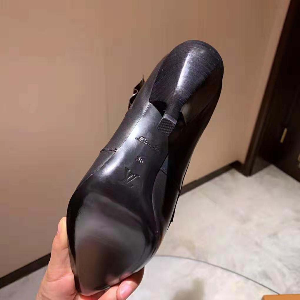 One of the key looks of the Spring-Summer 2019 fashion show, this assertive, feminine style is distinguished by its angular silver-tone buckles, LV-engraved closure, pointed toe and shifted-back stiletto heel.