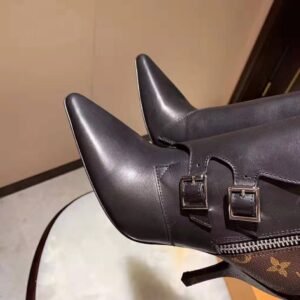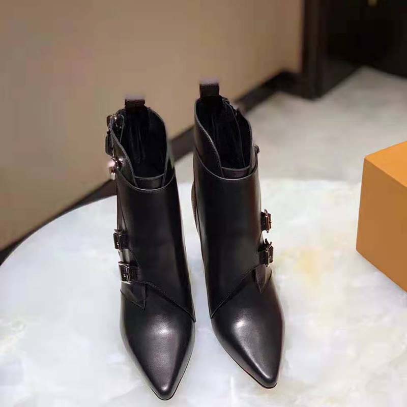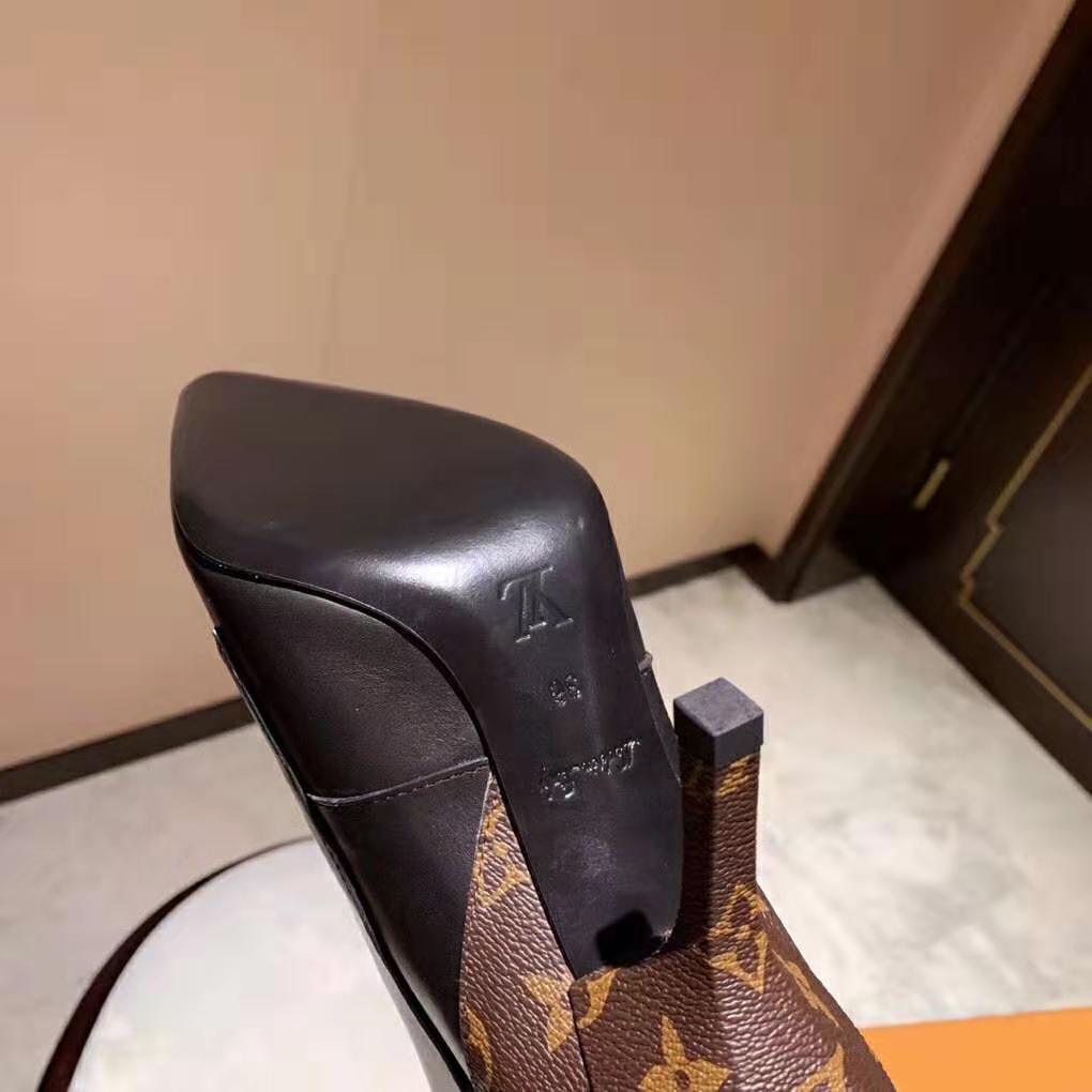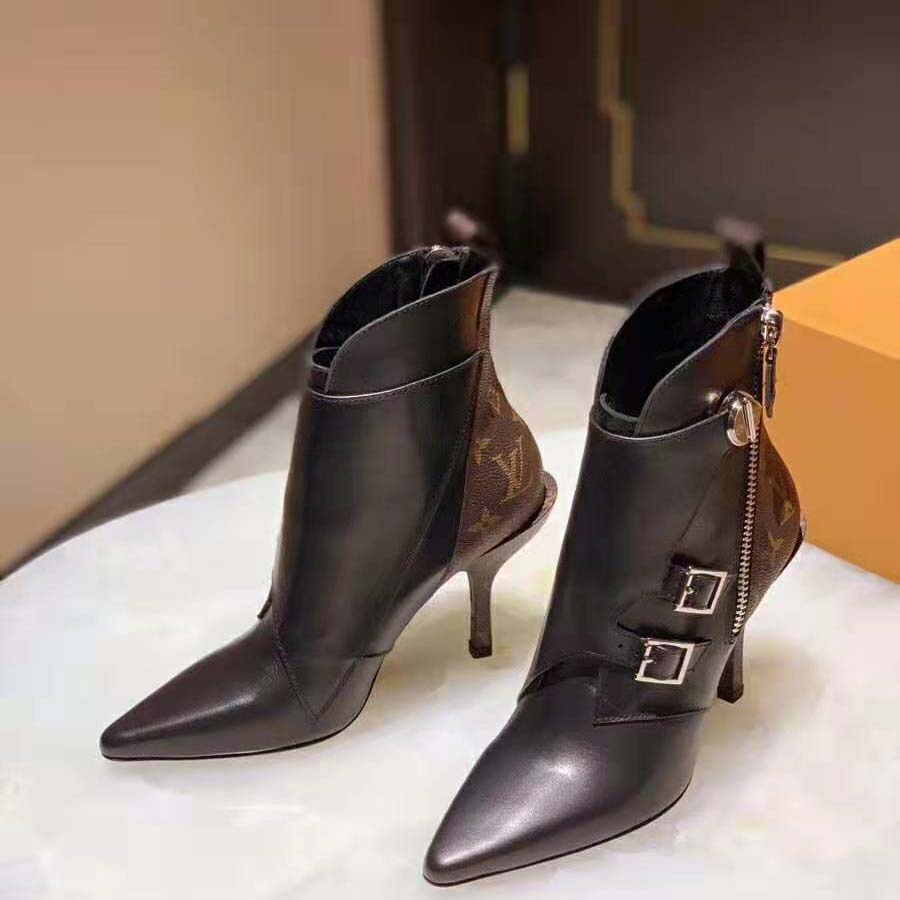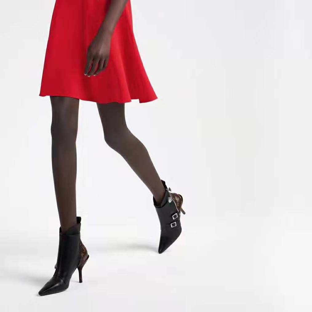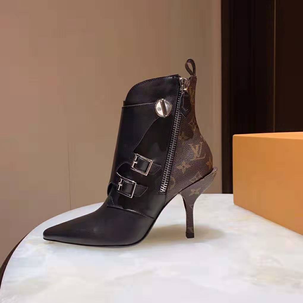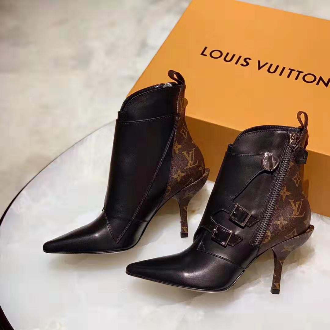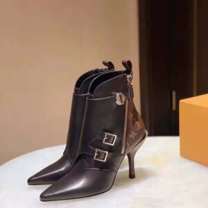 Crafted from black calf leather and patent Monogram canvas, the Janet ankle boot features a sharp, slim shape and a shifted-back stiletto heel.