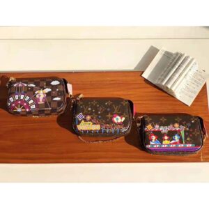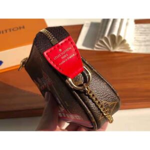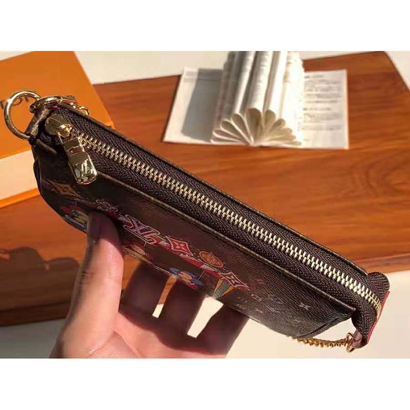 Louis Vuitton’s mascot Vivienne is pictured having fun at a fair on this Christmas 2020 edition of the Mini Pochette Accessoires in Monogram canvas.