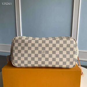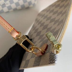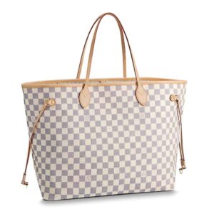 Crafted from fresh Damier Azur canvas with natural cowhide trim, it is ultra-roomy yet never bulky, with side laces that cinch for a sleek allure or loosen for a more casual look. Slim, comfortable handles slip easily over the shoulder or arm.