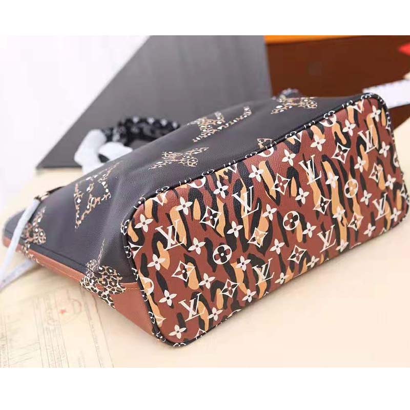 The Neverfull MM tote bag is fashioned from canvas with a print that combines different-sized Monogram patterns with animal prints.
