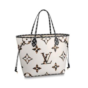 The Neverfull MM tote bag is fashioned from canvas with a print that combines different-sized Monogram patterns with animal prints.