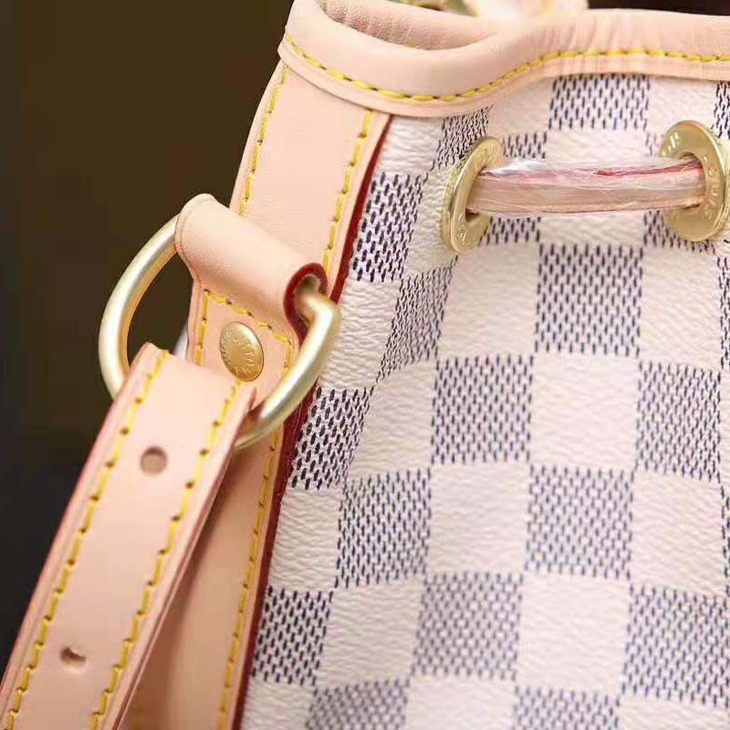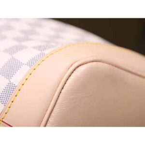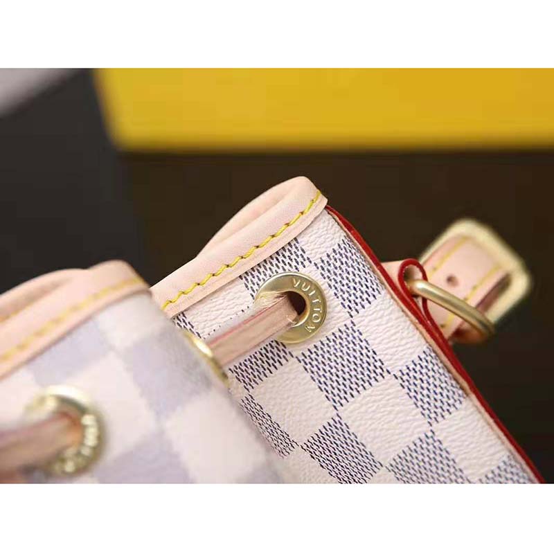 This charming version in body-friendly Damier Azur canvas retains key features of the original – the iconic shape and drawstring closure – but is made for modern life.