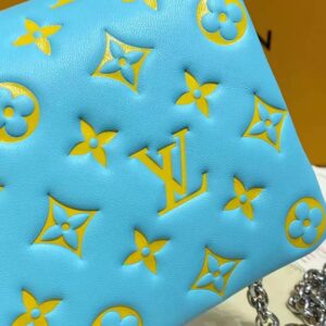 The Pochette Coussin is crafted from soft lambskin, which is embossed with the Monogram pattern to create a puffy, cushiony effect.