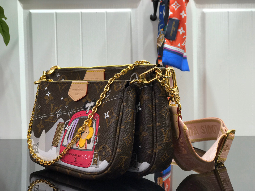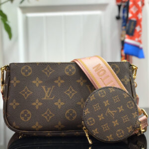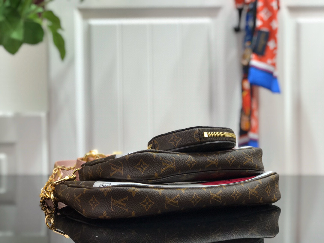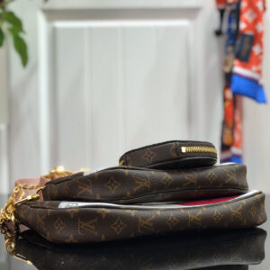 The Multi Pochette Accessoires is a hybrid cross-body bag with multiple pockets and compartments that brings together a Pochette Accessoires, a Mini Pochette Accessoires and a Round Coin Purse. Fashioned from Monogram canvas with a mini Monogram pattern on the sides of the two pochettes, it has both a removable gold-tone chain and an adjustable Louis Vuitton inscribed Jacquard strap for multiple carrying options.