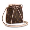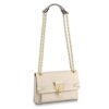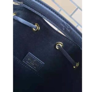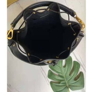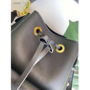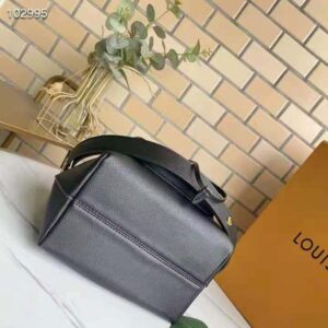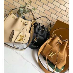 The Lockme Bucket bag in grained calf lather is immediately recognizable by its faceted LV turn lock on the front pocket.