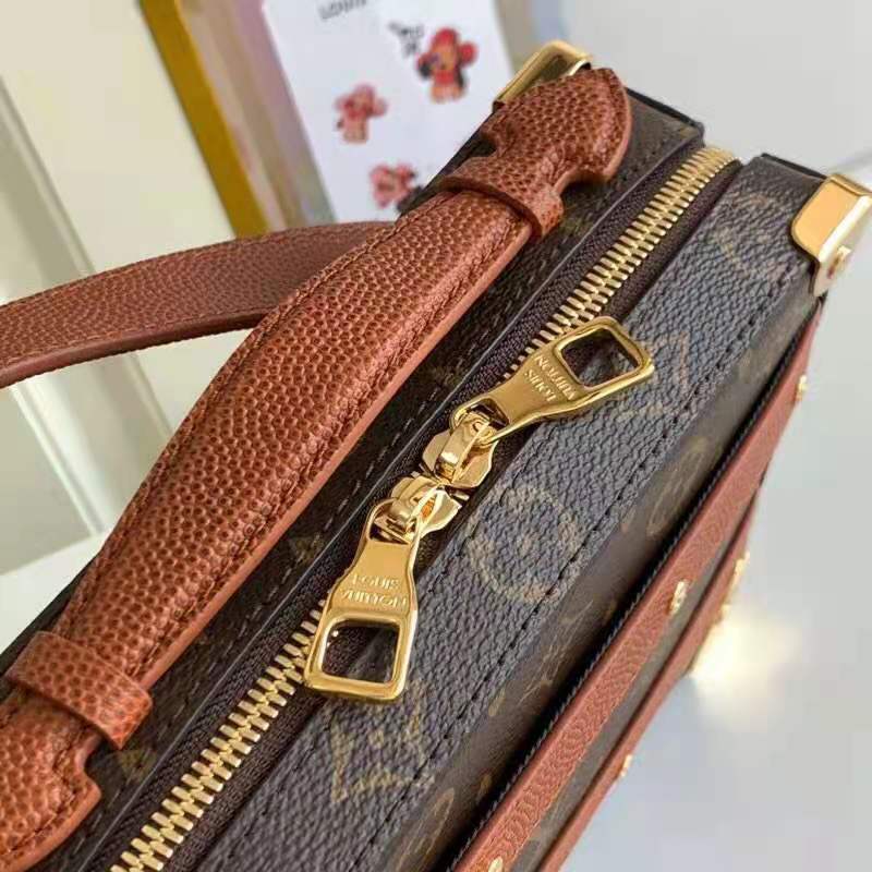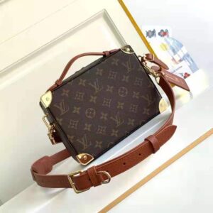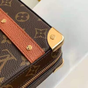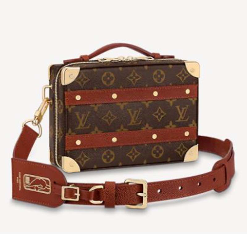 With its boxy shape, gold-color metallic corners, and rivets, the small Handle Trunk bag evokes Louis Vuitton’s iconic trunks.