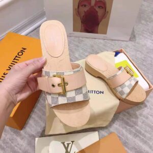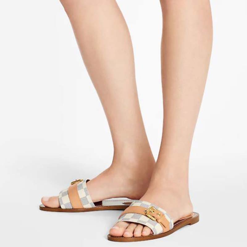 For the Summer 2021 collection, the iconic Lock It flat mule is revisited in Damier Azur canvas. The wide front strap is embellished with a second strap in natural calf leather with a Louis Vuitton-engraved, gold-tone buckle.