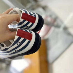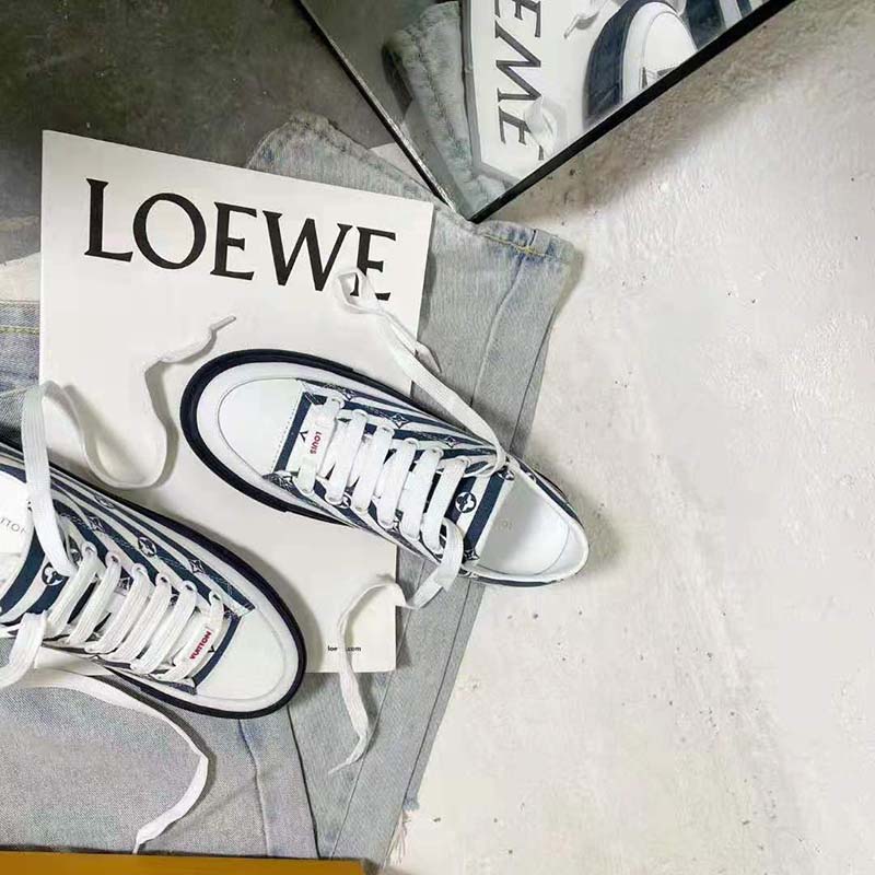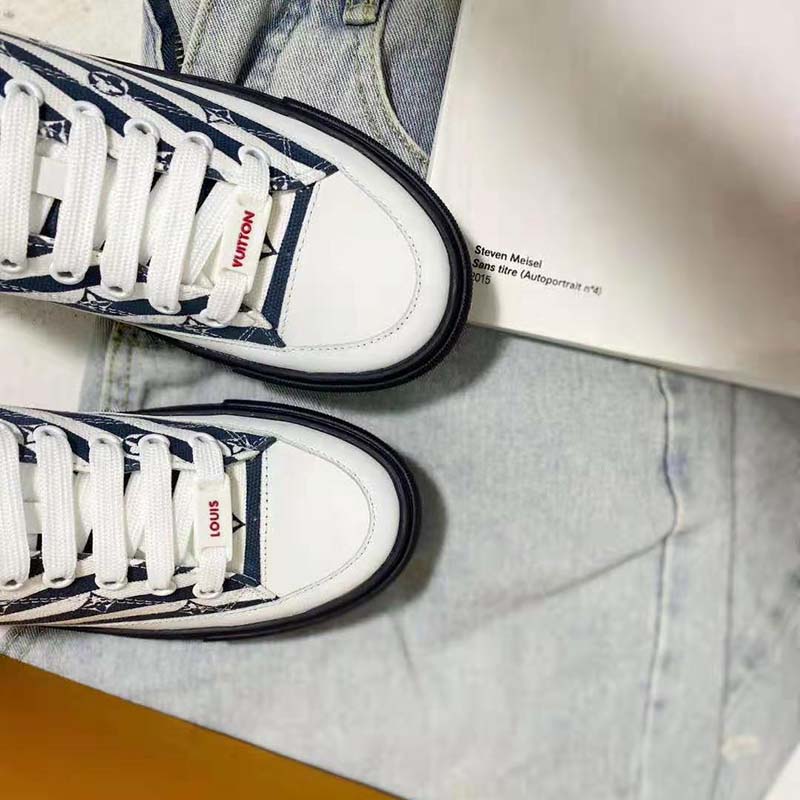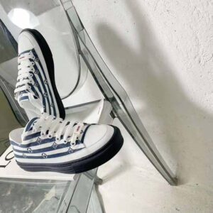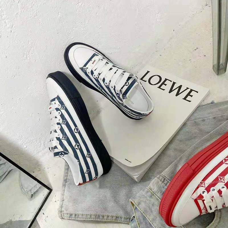 For the LV Escale Summer 2020 collection, the Stellar sneaker is revisited in cotton canvas with a print of stripes and Monogram Flowers inspired by the classic French marinière.