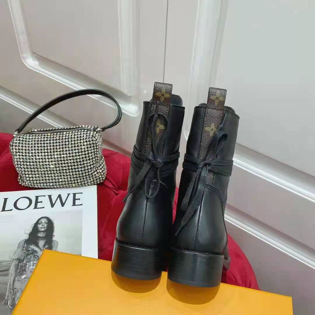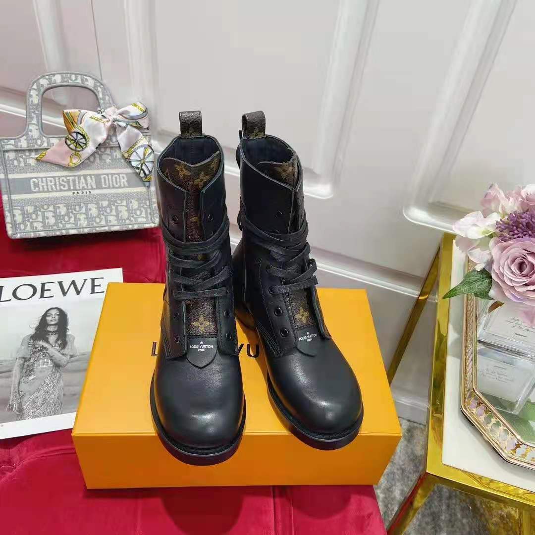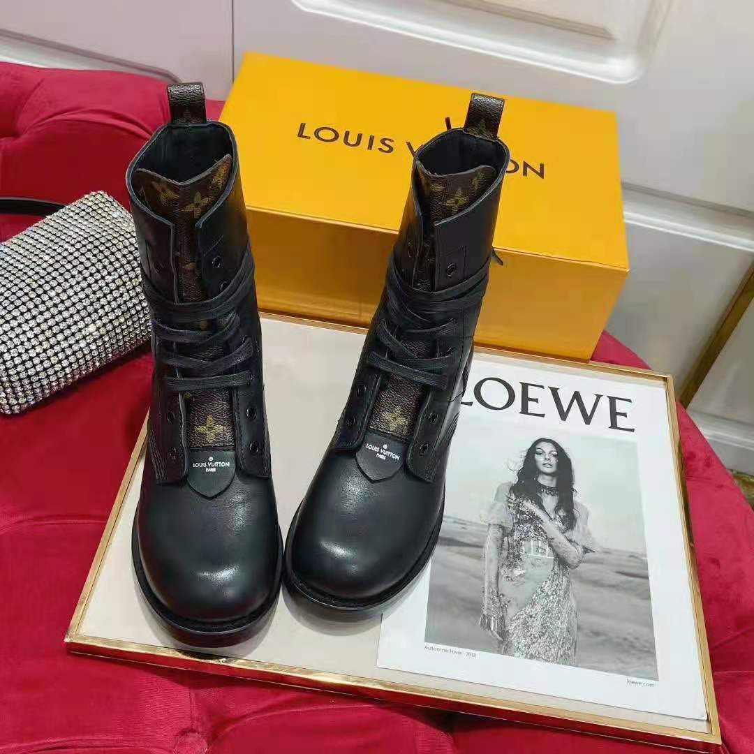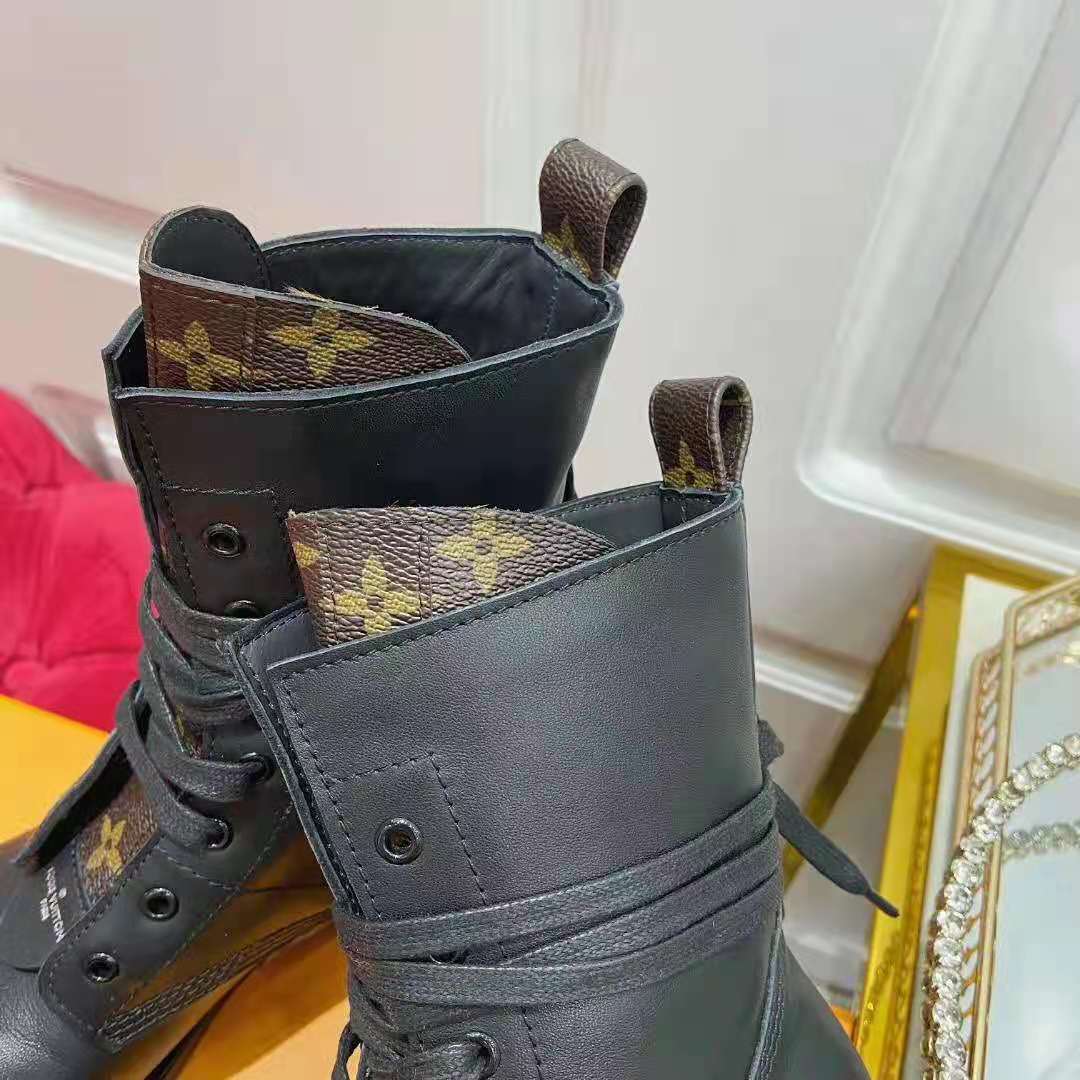 The Metropolis flat ranger in black calf leather and Monogram canvas is Louis Vuitton’s interpretation of the on-trend combat boot.