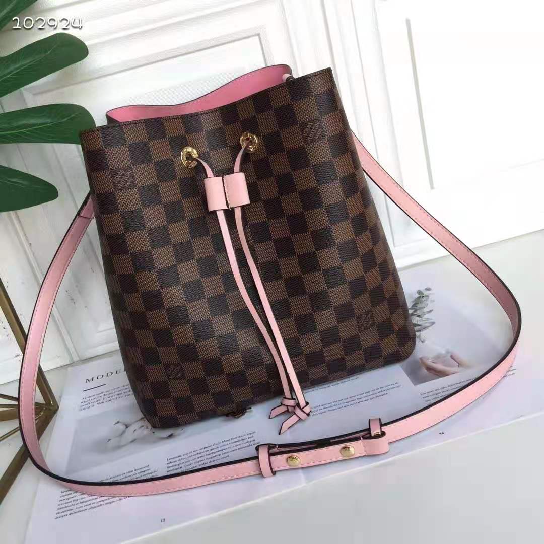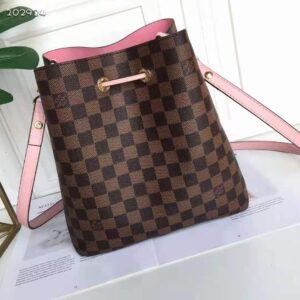 The NéoNoé bucket bag is fashioned from Damier Ebène canvas, accented with colorful details such as its drawstring and matching bonded lining.