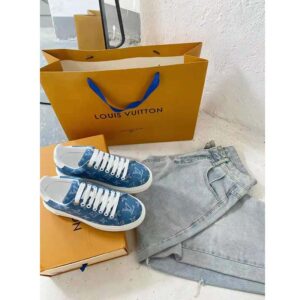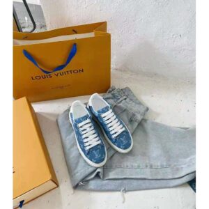 The Time Out sneaker is given a summery twist in blue Monogram denim with white laces and calf-leather trim.