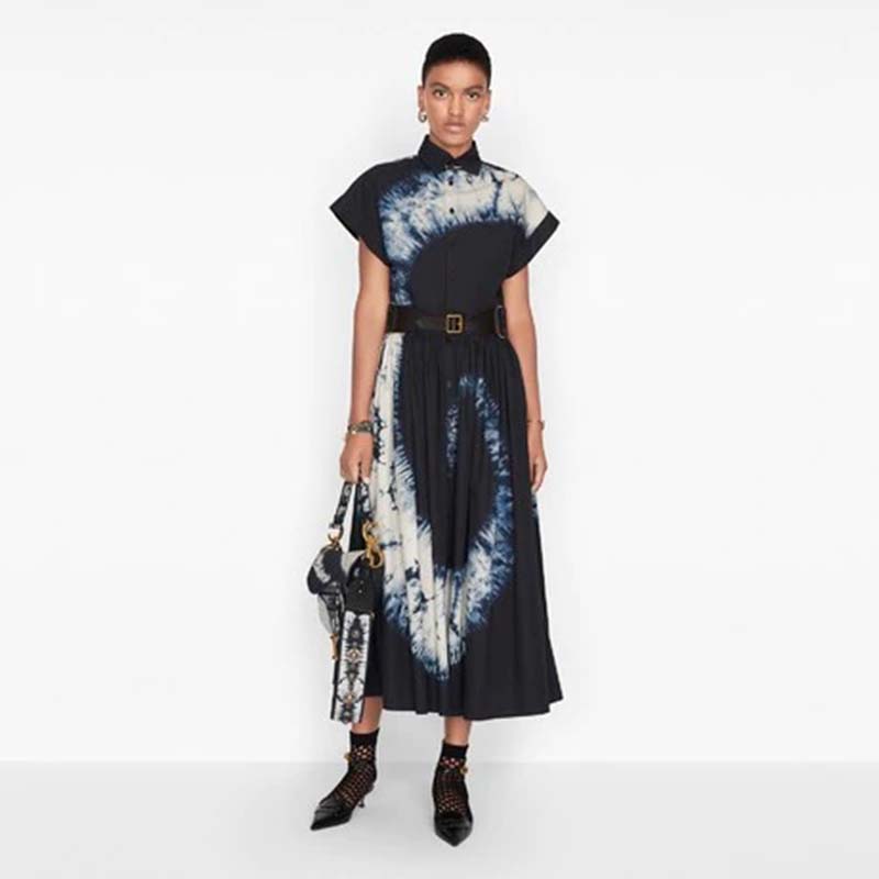 The fully embroidered blue tie & dye style has antique gold-finish hardware and the ‘Christian Dior’ signature on the front.