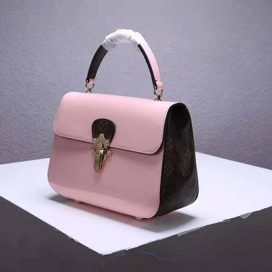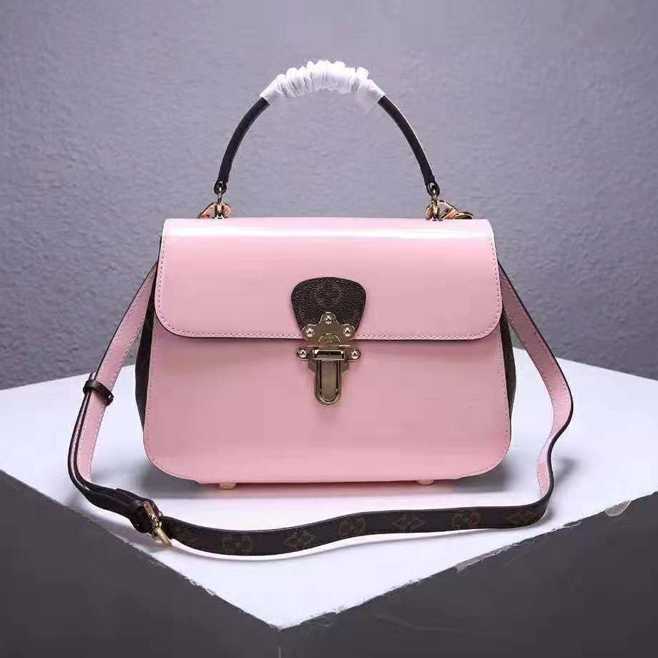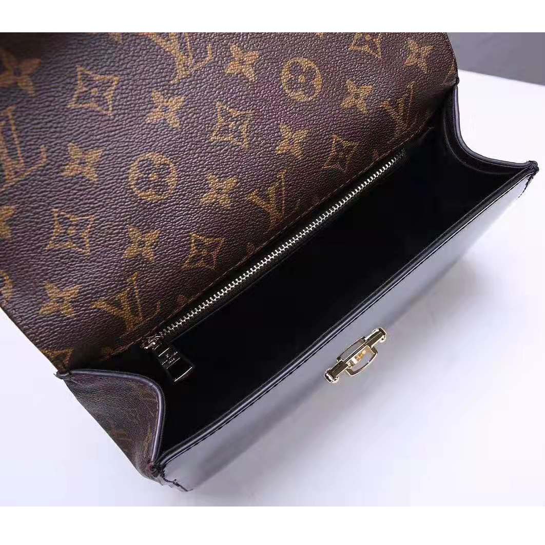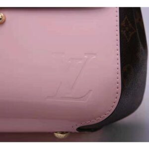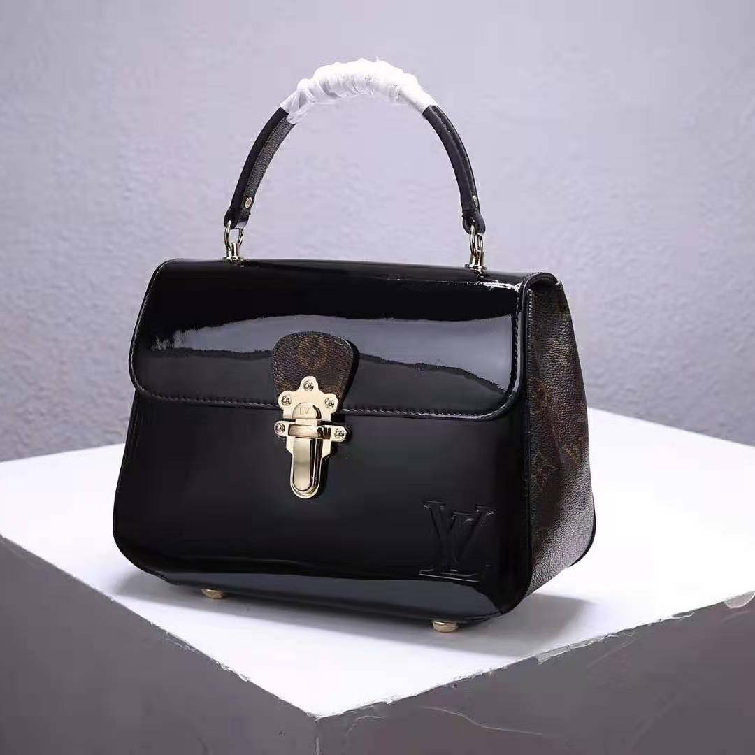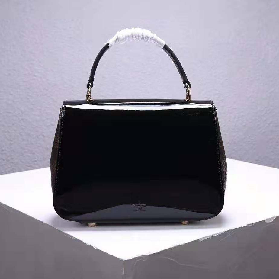 The ladylike Cherrywood PM in glossy patent leather features a top handle and removable strap trimmed with Monogram canvas.