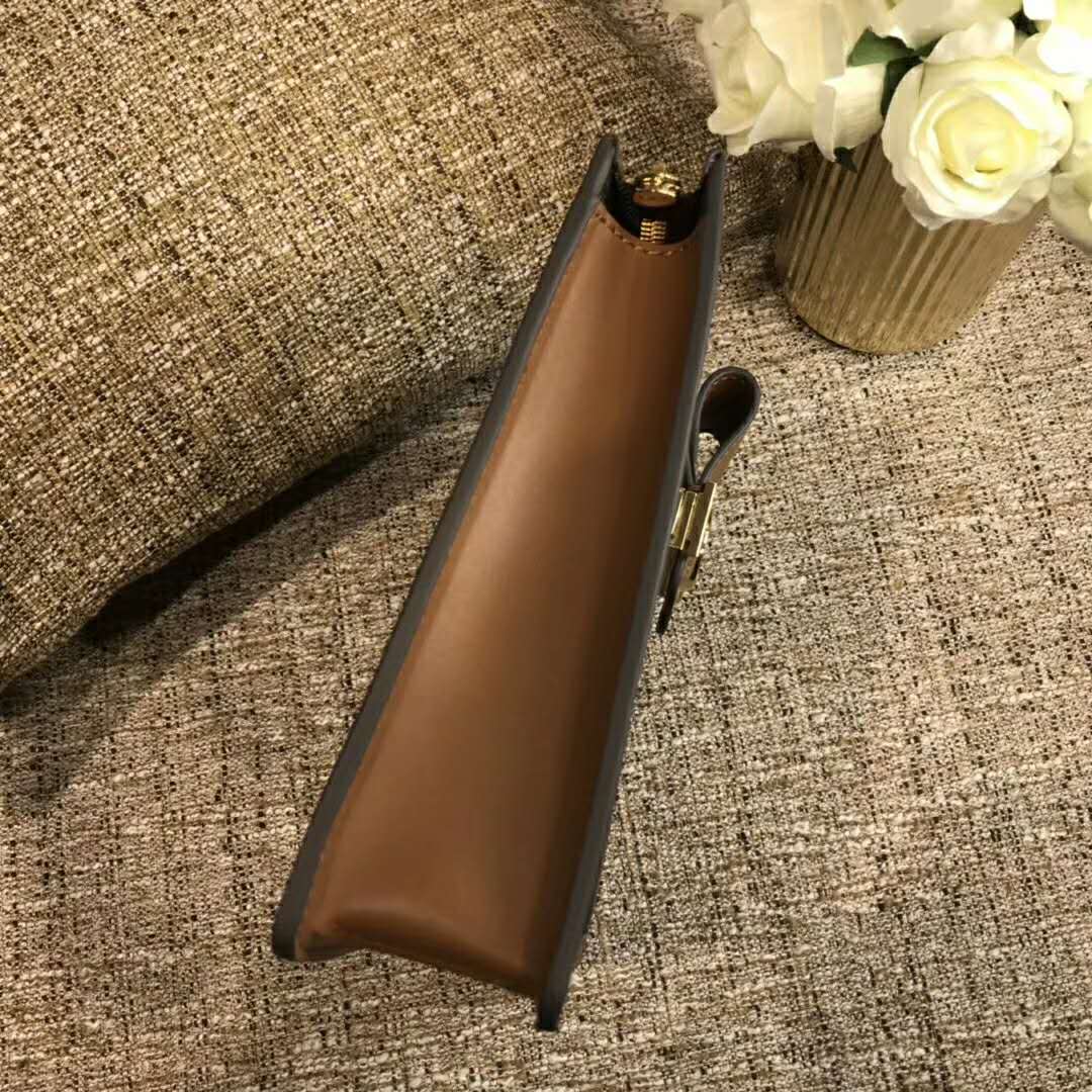This chic pouch, which can be hand-carried or slipped inside a bag, features the line’s signature vintage-look clasp and tan leather trim.