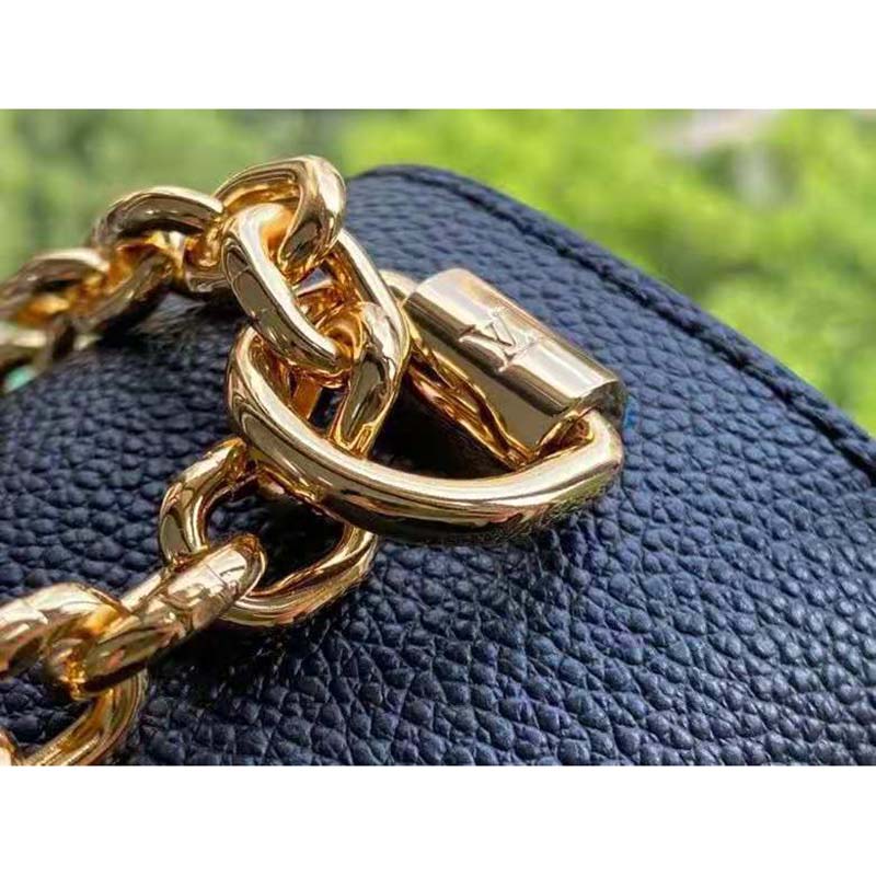A monogram canvas pad on the sliding chain strap provides comfort for shoulder and cross-body carry.